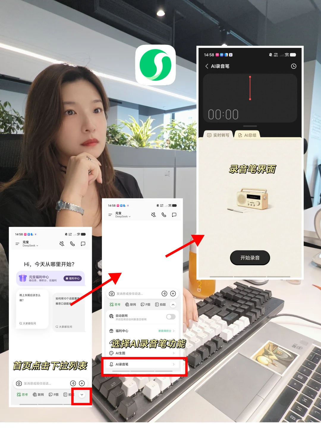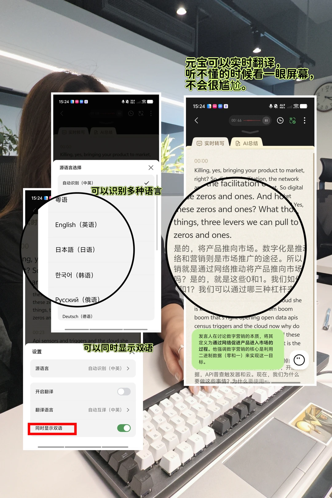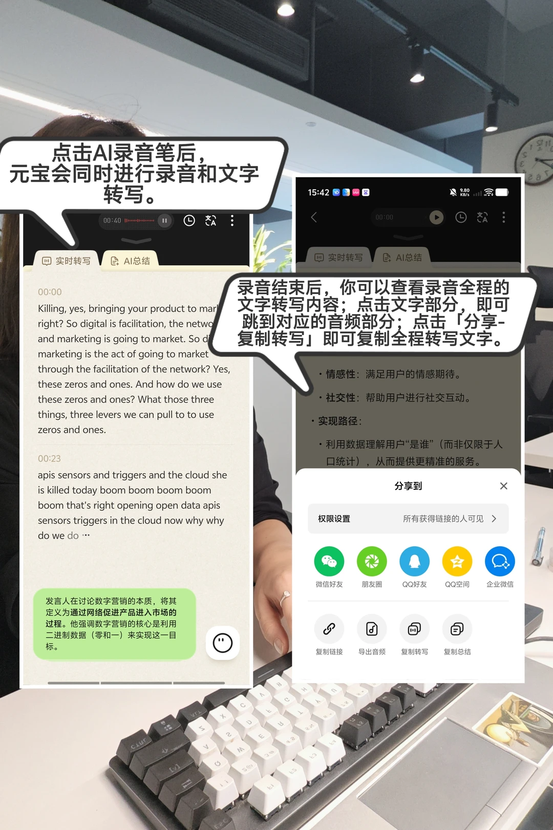 ✅例如我和老师线上 meeting ,直接用元宝的AI录音笔功能。它会一边录音,一边把内容实时转成文字,还支持双语翻译!但更实用的功能是,我在会后点击任意一句文本,就能跳转回听对应录音,特别方便我精准追溯老师讲解细节,做课后笔记,不用整段拖进度条找,效率高很多。