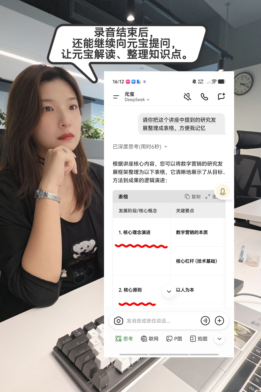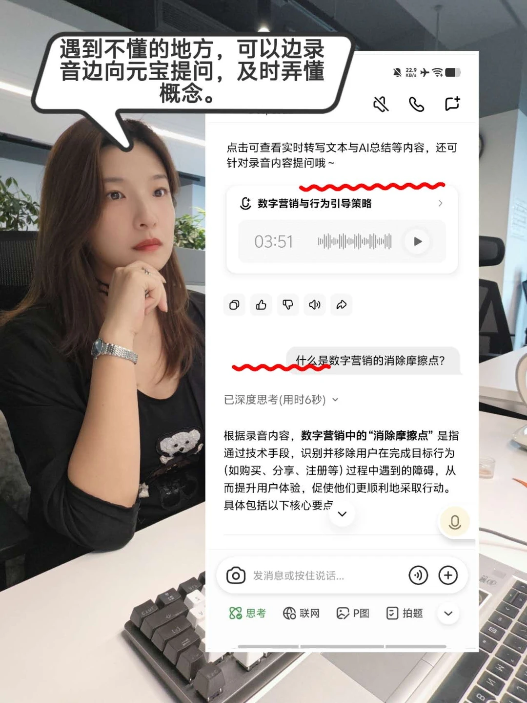 ✅元宝录音的时候还能实时提问,把概念先弄明白,至少不会影响后面的理解。会议结束后,也还能继续问,让它结合整场讨论帮我重新解释一遍,补课感很强。