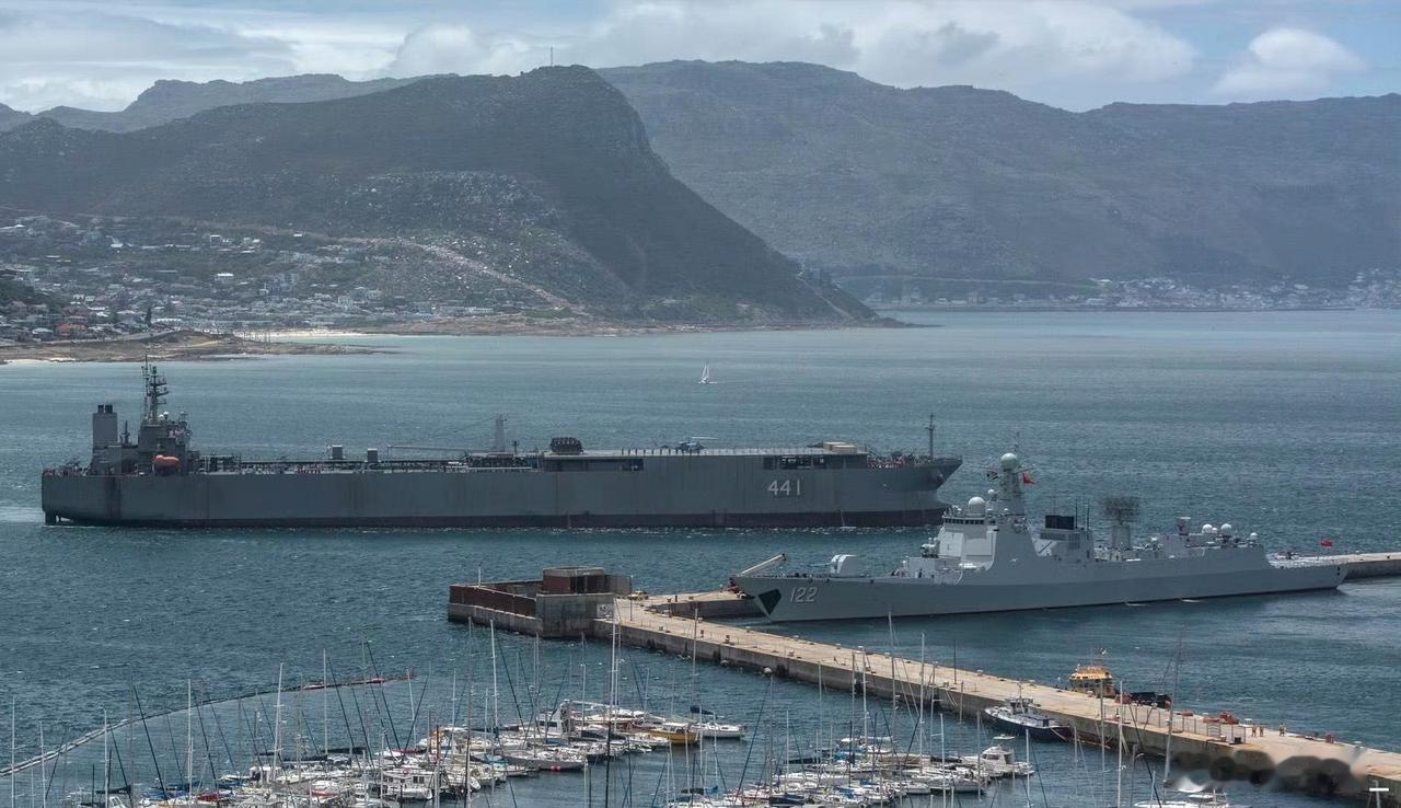 法新社:1月8日,中国海军唐山舰和太湖舰抵达南非西蒙镇港口,准备参加1月9日至16日举行的“和平意志 2026”金砖国家联合海军演习。图中还有一艘来参加演习的伊朗军舰。