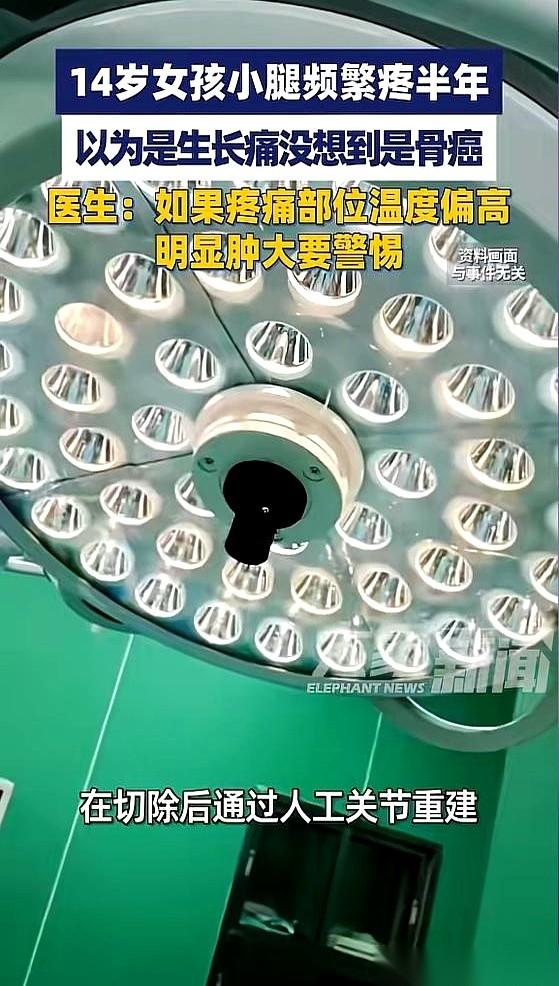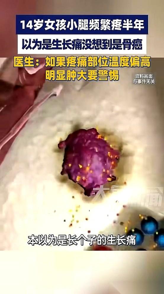 有句话,可能毁掉一个孩子,而我们几乎天天都在说:“没事,就是长个子的生长痛。” 河南郑州,一个14岁的女孩右小腿疼了整整半年。父母摆摆手,让她多休息。 半年里,这疼痛从一阵一阵,变成了一根钉子,专在半夜往骨头里钻。女孩开始睡不着觉,白天走路一瘸一拐。 直到那天,她爸妈终于觉得不对劲,掀开裤腿一看,两个人的手都僵住了。女孩的右小腿,肉眼可见地比左腿粗了一大圈,摸上去不是肉,是石头一样的硬。 医院的片子出来,一句话就砸懵了所有人:恶性骨肿瘤,已经啃掉了她三分之二的小腿骨。 这不是孤例。 另一个11岁的男孩,同样是腿疼,同样被当作“生长痛”忽略了半年。直到有一天,他没摔没碰,腿“咔”一声就断了。送到医院一查,骨肉瘤,癌细胞已经钻进了肺里。 还有个13岁的女孩,一直喊屁股疼。家人也没在意,直到发现她两边屁股大小都不一样了才去检查,肿瘤已经长到了20公分。 真正的生长痛,绝不会让身体变形。 如果你在孩子喊疼的地方,摸到了硬块,感觉那块皮肤比别处更热,或者看到任何不对称的肿大,那不是成长的代价,是身体在拉警报。 医生说,如果能早点发现,在癌细胞乱跑之前,孩子五年活下来的机会超过70%。可一旦拖到晚期,转移了,这个数字会直接掉到30%都不到。 那被耽误的半年,赌上的是一条命。 其实,戳破这个悲剧,成本低到离谱。 只要孩子身体任何一个地方,持续疼痛超过一个月,尤其是晚上更疼,带他去拍一张最普通的X光片。就这么一个简单的动作,据说能筛出85%的早期问题。 有时候,一次“虚惊一场”的检查,和一句“当初要是”的悔恨,真的就隔着一张片子的距离。