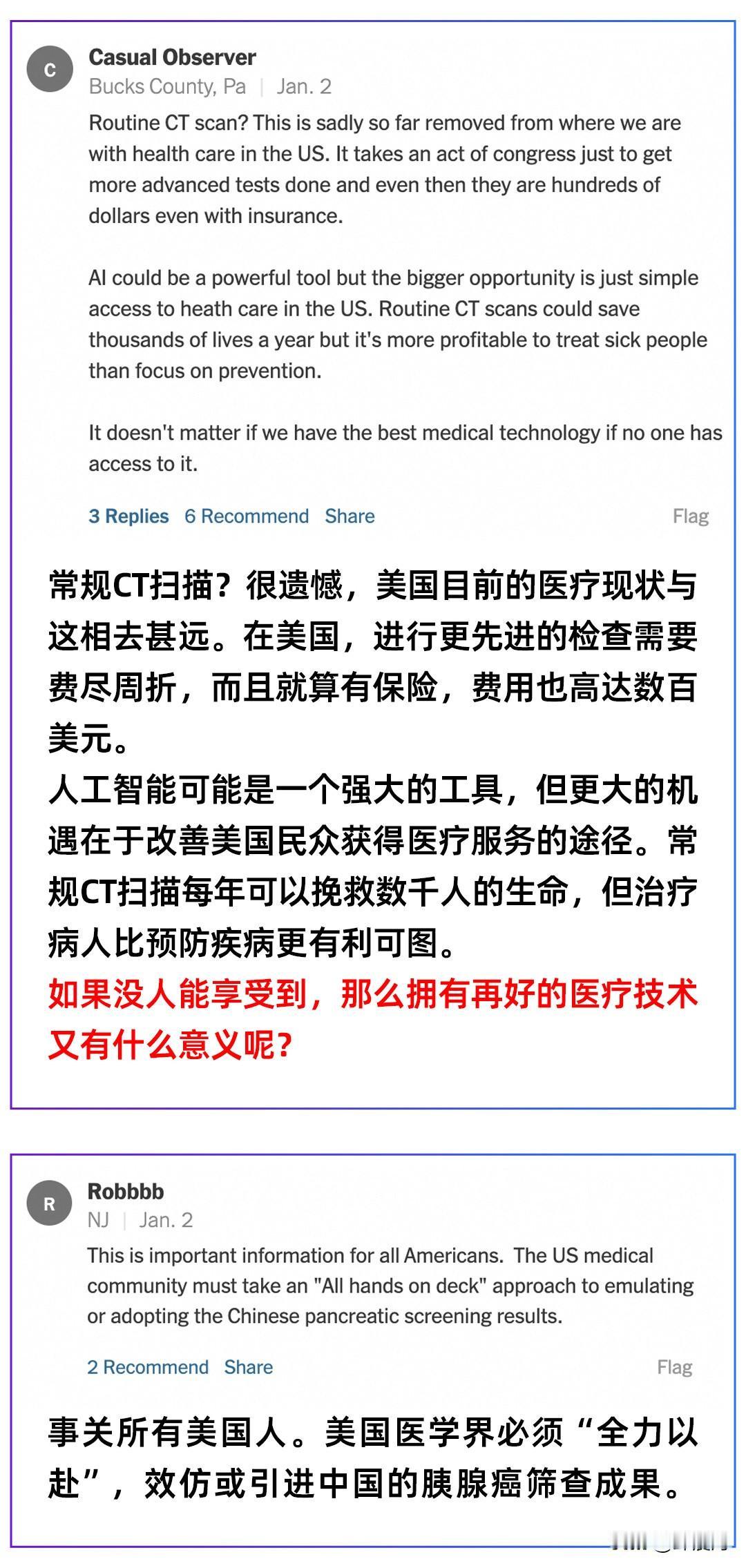 意料之外,《纽约时报》开年第一篇关于中国报道,美国网友一反常态全在为中国叫好! 2026年刚刚开始,《纽约时报》就提到中国,发布了一篇题为《AI正在中国发现医生可能遗漏的致命肿瘤》的报道。 在这篇报道中,详细介绍了一个案例,一个57岁的患者,在进行糖尿病检查时,借助阿里达摩院的胰腺癌筛查AI模型PANDA,成功筛查出了早期胰腺癌,实现早发现早治疗。 最喜欢抬杠的外媒,这次的报道居然正的发邪,这样的情况确实有点反常,可以说是很罕见的。 而更让人没想到的是,美国网友的评论更是非常有意思,居然是清一色的叫好声。 一个美国网友就评论道:“这是致命癌症检测方面的一项重大突破,为人工智能在其他癌症领域的应用开辟了道路。同时这篇文章也给美国新闻媒体上充斥的各种人工智能恐慌论调带来了一股清流。” 另一个美国网友更是直言:“这事关所有美国人,美国医学界必须全力以赴,效仿或者引进中国的胰腺癌筛查成果。” 其实这也不怪美国的网友这么激动,因为从评论中,时不时就能看到一些美国网友晒出了因为各种检查所花费的医疗账单,几千上万美金的都有。难怪之前有报告说,41%的美国人都掏不起一晚上的急诊费。 可见,高昂的检查费用早就让他们迫切需要一个能够打破现状的东西出现,而在中国,却已经把阿里最新的胰腺癌筛查技术用上了,全身CT扫描也仅需25美元。用25美元就能查出人人闻之色变的癌症,这样的科技普惠美国网友自然也想要。 不得不说,不管是在世界任何一个角落,一个好的技术,都会受到普通人追捧,而这一次的中国AI无疑是绝对的主角!