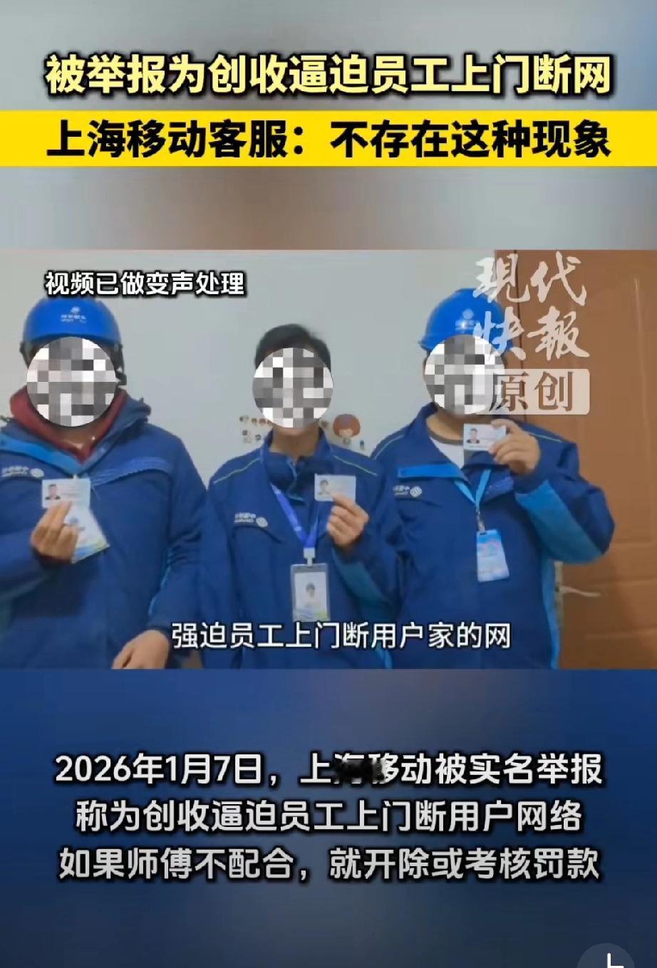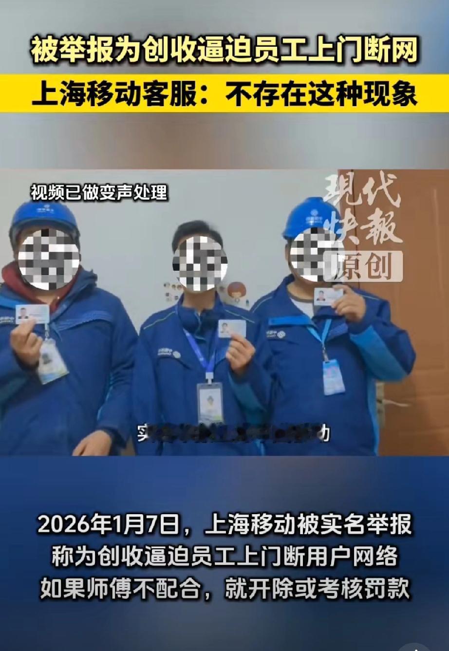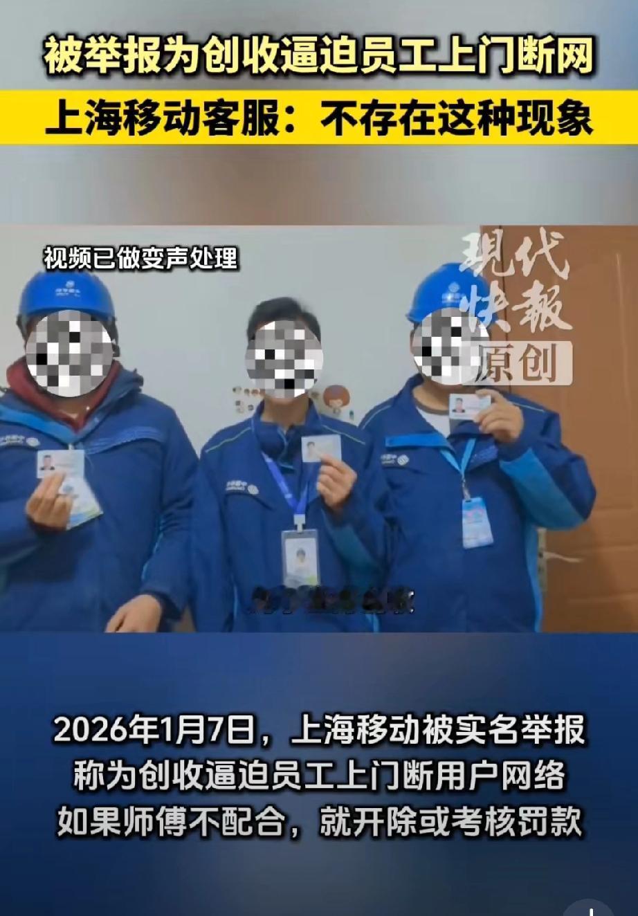 网友举报上海移动逼员工上门断网”这事到了这里的确报警最佳,蹲个公安调查结果。对这三人: 穿工服、配工牌、拿身份证实名举报,看着要么不是说假话,要么是海外人员假冒身份拍视频搞事情,感觉还是前者几率大些; 对移动公司:你说它套路多是对的,但是你要说“要求员工断网低端客户。强迫报修或诱导办理业务”,这就挺魔幻了,根本不现实。 那问题出在哪里?如果三人说的是真的,会不会中间环节出了问题?毕竟如今的营销创收任务还真的挺高的。我也遇到过几次电信营运商的客服说赠送我流量,问我要不要换套餐?我直接反问是费用不变吗?有几次都把客服整笑了… 看看后续吧,现在原视频下架了,这事儿到底真相如何,还得等后续调查。如果是谣言,造谣者肯定得担责;要是真有这种情况,那上海移动可得好好整改了。移动乱开业务 移动公司骗局 黑心移动公司