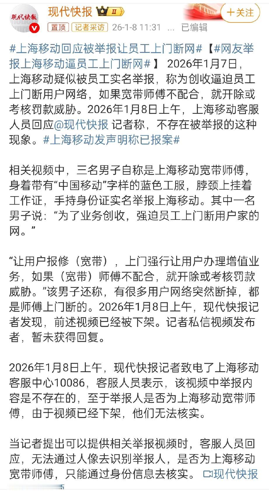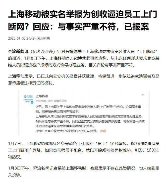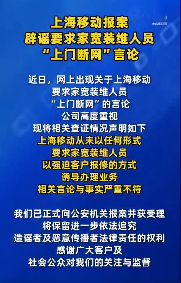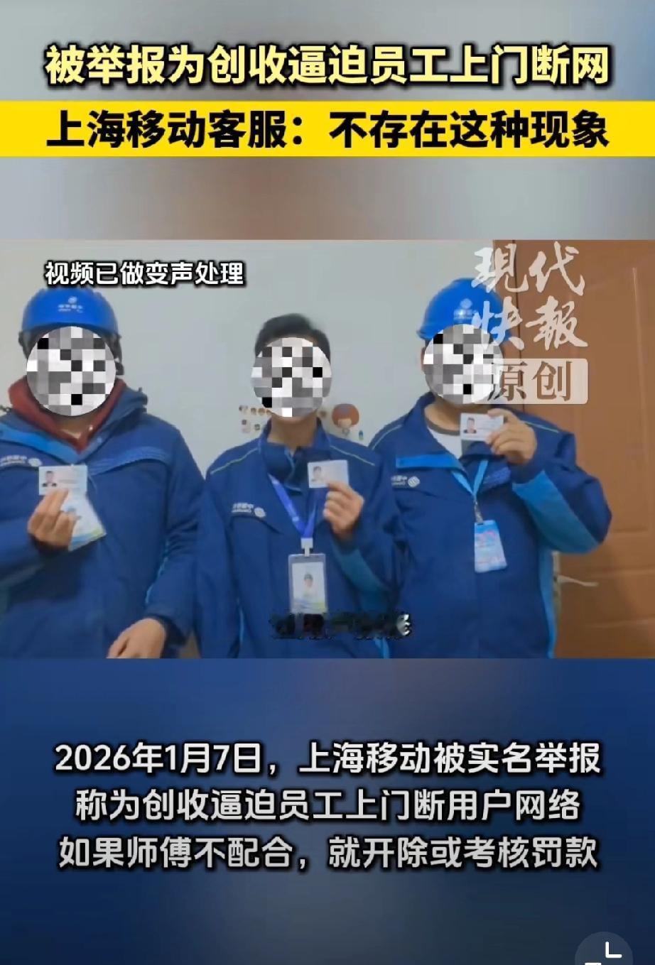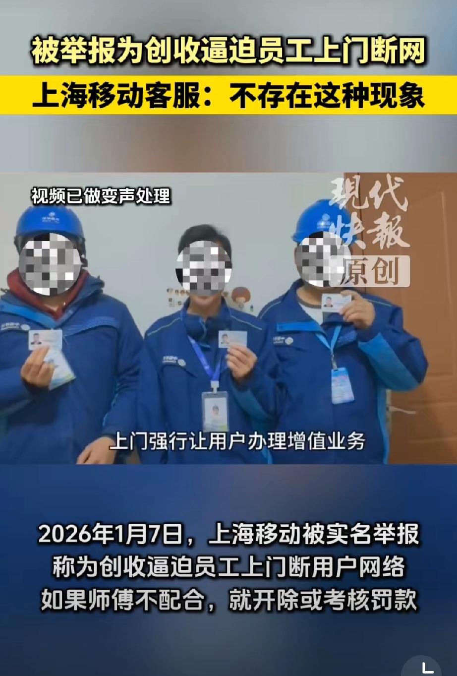 网友举报上海移动逼员工上门断网”这事到了这里的确报警最佳,蹲个公安调查结果。对这三人: 穿工服、配工牌、拿身份证实名举报,看着要么不是说假话,要么是海外人员假冒身份拍视频搞事情,感觉还是前者几率大些; 对移动公司:你说它套路多是对的,但是你要说“要求员工断网低端客户。强迫报修或诱导办理业务”,这就挺魔幻了,根本不现实。 那问题出在哪里?如果三人说的是真的,会不会中间环节出了问题?毕竟如今的营销创收任务还真的挺高的。我也遇到过几次电信营运商的客服说赠送我流量,问我要不要换套餐?我直接反问是费用不变吗?有几次都把客服整笑了… 看看后续吧,现在原视频下架了,这事儿到底真相如何,还得等后续调查。如果是谣言,造谣者肯定得担责;要是真有这种情况,那上海移动可得好好整改了。移动乱开业务 移动公司骗局 黑心移动公司