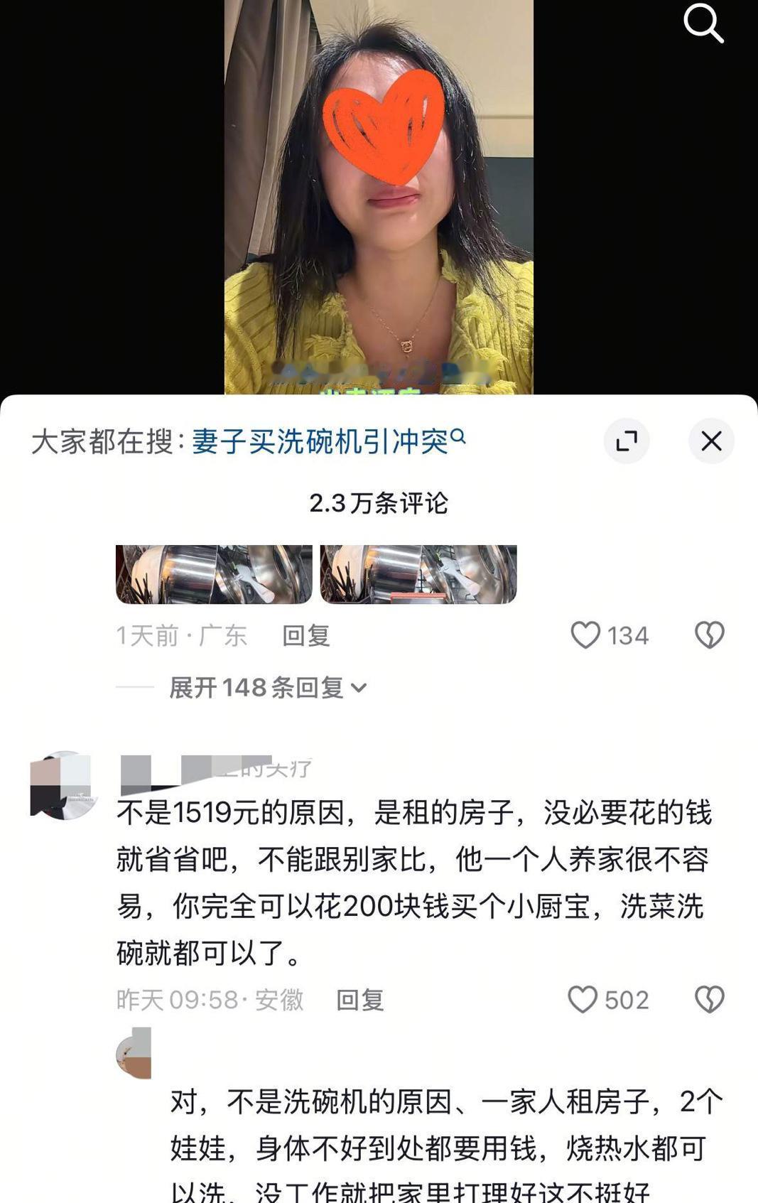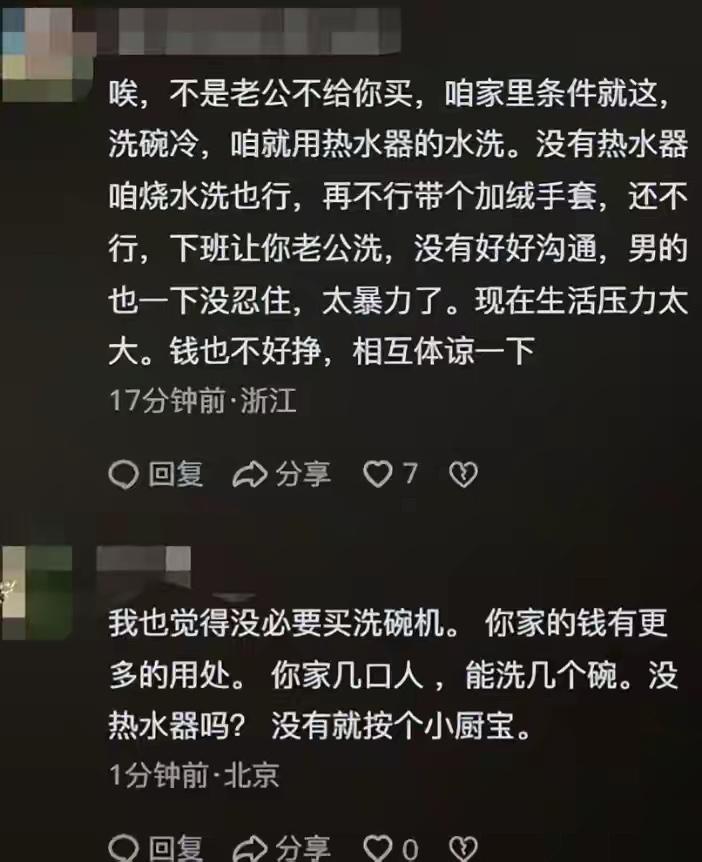 实话实说,热搜上的洗碗机砸家事件的女主长得好看,妆容精致,涂着美甲,在社交平台上哭得梨花带雨,她不理解她老公月薪过万为啥买个一千五百多的洗碗机居然能砸家,她把洗碗机退了,她哭着领着孩子住酒店去了 一开始看到女的说买洗碗机老公砸家了,还挺同情女的,后来信息越来越多,发现这个女的真的没法共情,家是两个人的,虽然两个孩子都是女的在带,但是一家四口就一个人挣钱,而且开销也很大,这样日子不是很富裕,而相反觉得女的花钱大手大脚,那个美甲普通人一周的伙食费了,就厨房那条件洗碗机进去都憋曲,不上班最起码把家里整理干净,照顾好后勤工作,家里才会欣欣向荣,夫妻要互相体谅,一个家如果仅靠一个人挣钱,而且不是挣得特别多,仅够一家四口的正常开销,那就得算计着花钱,得考虑攒钱,要不万一有个意外发生,自己手里都没有钱,感觉女人任性了 对一个四口之家,月收入只有一万的家庭,说实话,租房,有20 W的外债,两个孩子,妻子身体健康状况不好一年,压力都在一个人身上,谁都有崩溃的时候!她不与丈夫商量买洗碗机,家里肯定有很多其它要花钱的地方,洗碗机又不是必需品,而且租房随时可能搬家,水凉,可以买个电热水龙头,现在还有橡皮手套里边带个薄薄的棉手套在凉的水也不怕 ,现在一般家庭有几家有洗碗机的。 男人不是不舍得花钱,是要把钱花到应该花的地方,这些年钱难挣,经济状况都不是很好,女主人身体不好,男人肯定会想到,应该俭省节约,以备不时之需,洗碗机不是刚需,没有洗碗机生活不会受到影响,如果生病了没有钱怎么办,总之这个女人做事欠考虑,没有理解男人良苦用心。 女的一个人带两个孩子也挺辛苦的,不比上班的轻松。互相理解最好。两个人过日子,上班的有空也应主动洗洗碗,给对方分担一下。 经济压力过大,把独自挣钱的男人压崩溃了,女子应该把男子的压力分担些,金钱上要合理安排,减少不必要的开支,能省就就省,渡过暂时的难关,后面的日子慢慢的就好了。 希望他们互相包容理解,丈夫去酒店把妻儿接回来,一家四口好好过日子,面包会有的,一切都会好的。