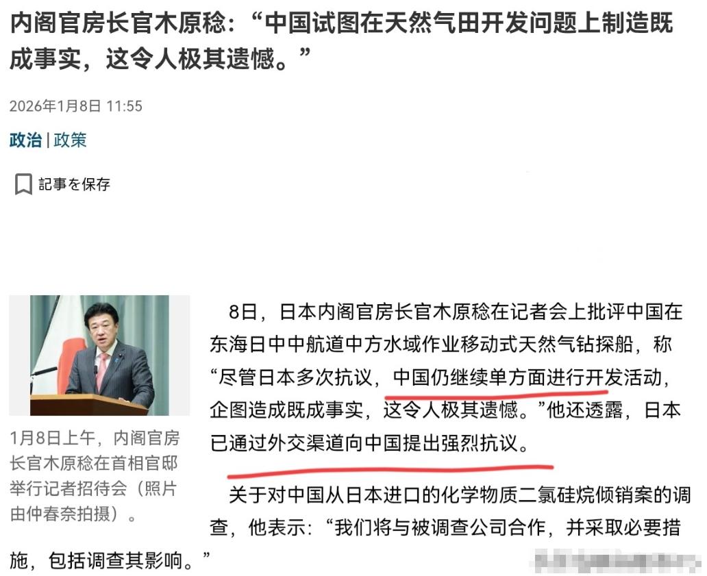 日本再次出来表态!1月8日,日本内阁官房长官木原稔在记者会上称,中国在东海日中“中航道”,中方水域作业移动式天然气钻探船一事,尽管日本多次抗议,中国仍继续“单方面”进行开发活动,“企图”造成既成事实,这令人极其遗憾。日本已通过外交渠道向中国提出强烈抗议。 大家怎么看,一起评论区唠唠! 讲真的,这话扔得很重,但先把几件事问清楚:谁在谁的海域?谁才真正在搞“既成事实”?谁又有什么资格喊“单方面”?其实拆开来看,他们的这一抗议纯属没事找事。 先看地方,现在作业的钻探船,就在春晓油气田一带,那片海域离浙江宁波东南三百多公里,中国上世纪九十年代就开始勘探,2000年代中期就投产,天然气一路送回宁波等地,用了这么多年,早就是中国稳定的气源之一。 也就是说,这不是突然插一口管子,而是一整套运行多年的能源工程。 更好笑的是,“中方水域”四个字,就是木原自己在记者会上说出来的,既然你都承认在中方水域,中国在自己地盘上架平台、打井、开发,再正常不过。 结果转头又骂成“单方面开发”“造成既成事实”,这不就是当场给自己甩耳光? 再往下看海底,东海不是一块空白,而是中国大陆自然往外延伸的大陆架,一路平缓铺到冲绳海槽才突然掉下去,那条海槽就像一堵海底大墙,把中国大陆架和琉球岛弧清清楚楚分开。 按“大陆架自然延伸”原则,这块平坦平台,天然就属于中国管辖范围,国际法院在北海大陆架案里早就说过,划界不能图省事画条“等距离线”,要看地质地貌,要讲公平。 《联合国海洋法公约》也是这个逻辑:划界要兼顾自然条件和公平原则,不是谁拿出一支笔在地图上画一条“日中中间线”,就能变成国际规则。 所谓“中间线”“中航道”,完全是日本自说自话,中国从来没承认,更别说还想把钓鱼岛这种岩礁往划界基点上塞,这已经不是抬杠,是公然跟国际法作对。 再翻翻过去几年,日本围着春晓演了多少轮戏,中国从勘探到投产,一步步公开推进,日本那边则一会儿派飞机船只远处拍照,一会儿炒“跨界储层”,一会儿递抗议照会。 2008年,中方为照顾大局,曾同意在坚持主权前提下,让日本企业按中国法律参与春晓合作开发,这已经是很有诚意的安排。 但日本不但没珍惜,还在划界上越闹越凶,“中间线”说得越来越硬,路子就是“先蹭一点,再抬条件”。 说到底,这次木原摆出一脸“极其遗憾”,背后不过三层小算盘,第一,能源焦虑,日本本土资源贫,自给率常年偏低,对东海海底这口“聚宝盆”觊觎很久,看着中国平台一台台下去,意识到这片海以后更难插手,心里当然不舒服。 国内政治要秀“强硬”,在日本政坛,对华喊话谁更猛,谁就更容易捞选票、讨好右翼和军工集团,木原站在台上念两段“严正表态”,回去就能当政绩吹。 第三,对外配合美国,美国一直想在亚太制造紧张气氛,东海、南海全是现成舞台,日本乐意扮演“受害方”,一边喊“我好担心”,一边拿这套说辞为扩军、修安保文件当挡箭牌。 中国这边的态度反倒一直很稳定:有理有据,该干继续干。 法理上,不承认日本单方面划的“中间线”,坚持按大陆架自然延伸和公平原则来谈划界;现实里,春晓一带的开发早已纳入长期规划,钻探平台有节奏地作业,不会因为东京说了几句“遗憾”就按下暂停键。 而外交上,咱们不拒绝谈,但前提是平等协商、尊重事实,而不是一边搞小动作、一边给中国扣“单方面”帽子。 用一句话说透:抗议电报可以发一沓又一沓,钻井平台一分钟都不会为此停转,我们在自己主张的管辖海域开发油气,是主权国家正当权利,轮不到日本颐指气使,真正让东海紧张的,不是咱们打井,而是日本一边跟踪骚扰,一边在舆论上倒打一耙。 从趋势看,这类“极其遗憾”的表演,以后只会越来越没存在感,中国在东海油气开发上,设备有了,技术成熟了,法理站稳了,这才是真正不可逆的“既成事实”。 日本再想靠几句重复的外交辞令叫停,是拿嘴硬对着现实撞墙,他们可以继续在镜头前摆出忧心忡忡的表情,咱们则会继续在自家海里干自家的活,等哪天东京真想让东海安稳,恐怕得先学会少点表演,多点认账。 对此,大家有什么想说的呢?欢迎在评论区踊跃留言!麻烦看官老爷们阅读后点赞关注,谢谢! (个人观点,理性观看)
