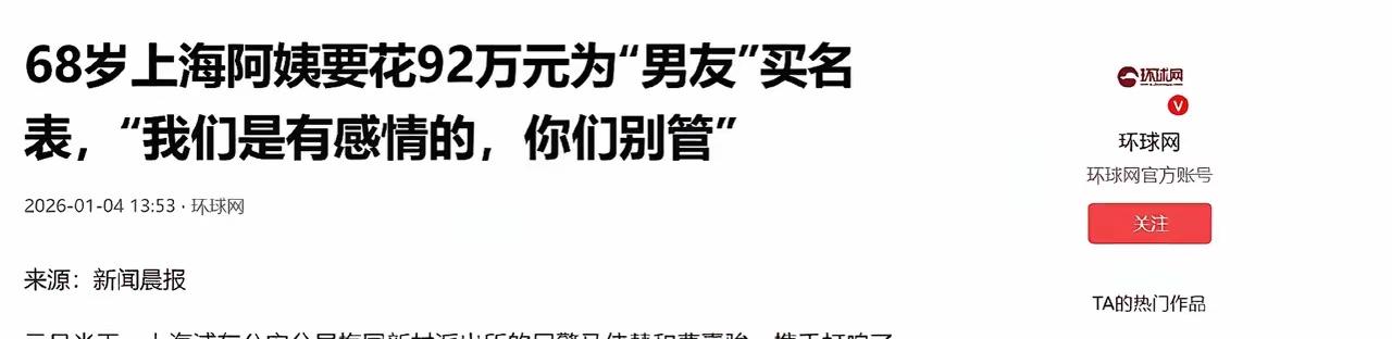 92万的手表差点打水漂!上海这位阿姨的遭遇,看着荒唐却戳中了无数人的软肋——骗子骗的哪里是钱,分明是独居长辈心里那点没被填满的情感空缺。 短视频平台认识的“现役军人”男友,每天早安晚安嘘寒问暖,记得她的腿疼、聊得来家里事,几句贴心话就让阿姨卸下了防备。等感情“升温”,就抛出“珠宝APP充值100万被卡,寄块表激活就能提现还赚8万”的诱饵,把贪念和信任绑在一起,一步步引她走进陷阱。要不是手表店老板心细报警,这一辈子的积蓄可能就成了骗子的“战利品”。 最让人揪心的是,民警到场后把套路拆解得明明白白:正规平台从没有“先花钱再提现”的规则,军人更是严禁在社交软件交友,更不会拜托陌生人办所谓“内部渠道”的事。可阿姨偏要硬撑,攥着包带不肯松口,嘴里念叨着“有感情”,其实是舍不得那份久违的被关心的感觉。这哪里是执迷不悟,分明是孤独太久,把虚假的温暖当成了救命稻草。 好在民警没有硬怼,而是搬来椅子慢慢疏导,翻出同类案例一点点对比,用耐心化解了她的抵触。一个小时后,阿姨脸色变了、眼神软了,终于放弃扫码,这场闹剧才得以收场。网友说得对,店主和民警拦住的不只是92万,更是帮阿姨守住了晚年的安稳,解开了心里那份缺爱的心结。 现在很多情感诈骗都盯着独居长辈,他们抓住老人社交圈窄、渴望陪伴的弱点,用廉价的关心换取信任,再用“高回报”的谎言收割财产。这些骗子最恶毒的地方,是先给老人一颗糖,再狠狠抢走他们的一切,不仅骗走积蓄,更会留下难以愈合的心理创伤。 其实防范这类骗局很简单:记住“军人不网聊交友、正规平台不设提现门槛、真关心你的人不会让你掏钱”这三点就够了。但更重要的是,家人要多给长辈一点陪伴,哪怕只是每天打个电话、偶尔聊聊天,填补了他们的情感空缺,骗子自然就无缝可钻。 阿姨走出店门时步子放慢了,手机揣得很紧,想必是既后怕又庆幸。这场虚惊也给所有人提了个醒:对长辈的关爱,从来都不是给钱给物就够了,多些倾听、多些陪伴,才是抵御骗局最坚固的防线。别让孤独,成为骗子可乘之机。 说说你身边类似的经历吧