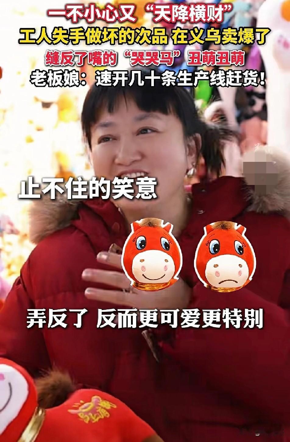 笑不活了! 义乌次品哭哭马卖爆,老板开几十条生产线赶货 义乌工人失手把马年吉祥物的嘴缝反 造出“哭哭马”次品,没想到凭丑萌模样火出圈 比正版“笑笑马”更受网友喜爱 老板娘直呼“弄反了反而更可爱” 紧急开几十条生产线赶货,还坦言“实在来不及做了” 网友调侃:这就是现实版“塞翁失马”! 这届网友的审美果然不一般 你觉得哭哭马和笑笑马哪个更可爱?