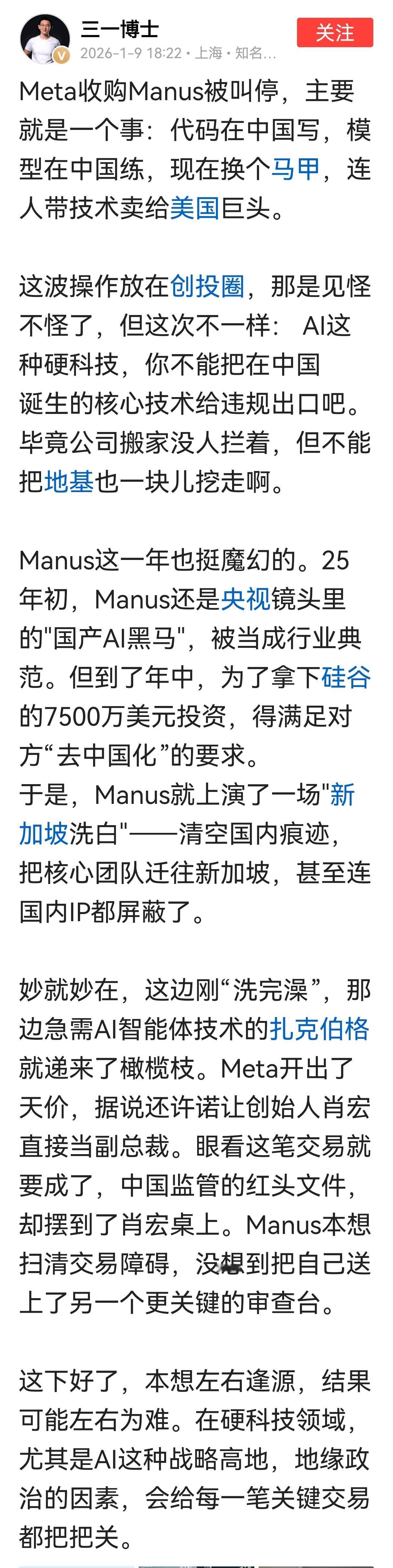 Meta收购Manus被叫停,还有很多自诩为专家的人替Manus叫屈,说人家Manus不是大模型,根本就不是利用国内大量数据投喂而训练出来的。说什么Manus是做应用层面的,是帮助大家使用大模型算力的工具,是一个应用大模型产生生产力的工具。这话表面听起来没问题,但Manus本身的产生是积累了超过2000个行业任务模板库和3200个错误应对方案,并结合用户持续反馈持续迭代而成的“重应用数据、轻基座微调”模式。如果没有国内这么多行业任务模板库和试错数据,如果没有国内这么多优秀的工程师,哪来的Manus?