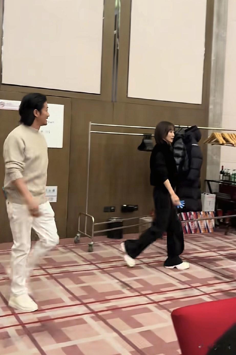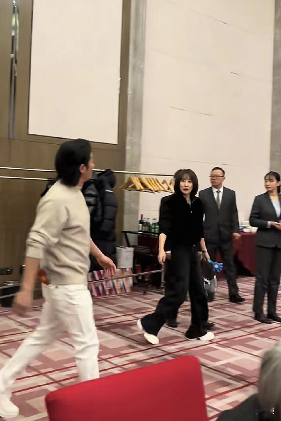 在室内的活动现场,吴京浅米色上衣与白色休闲裤、脚踩白色鞋子,谢楠全黑穿搭搭配白色鞋子