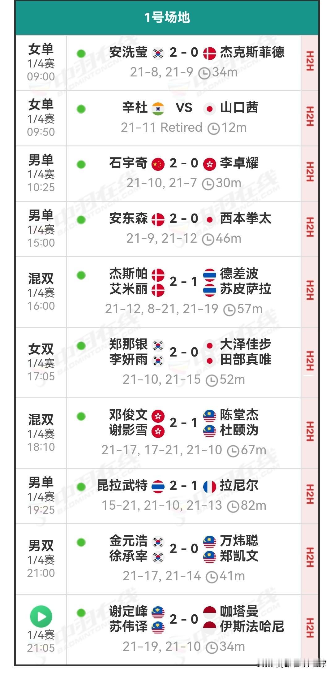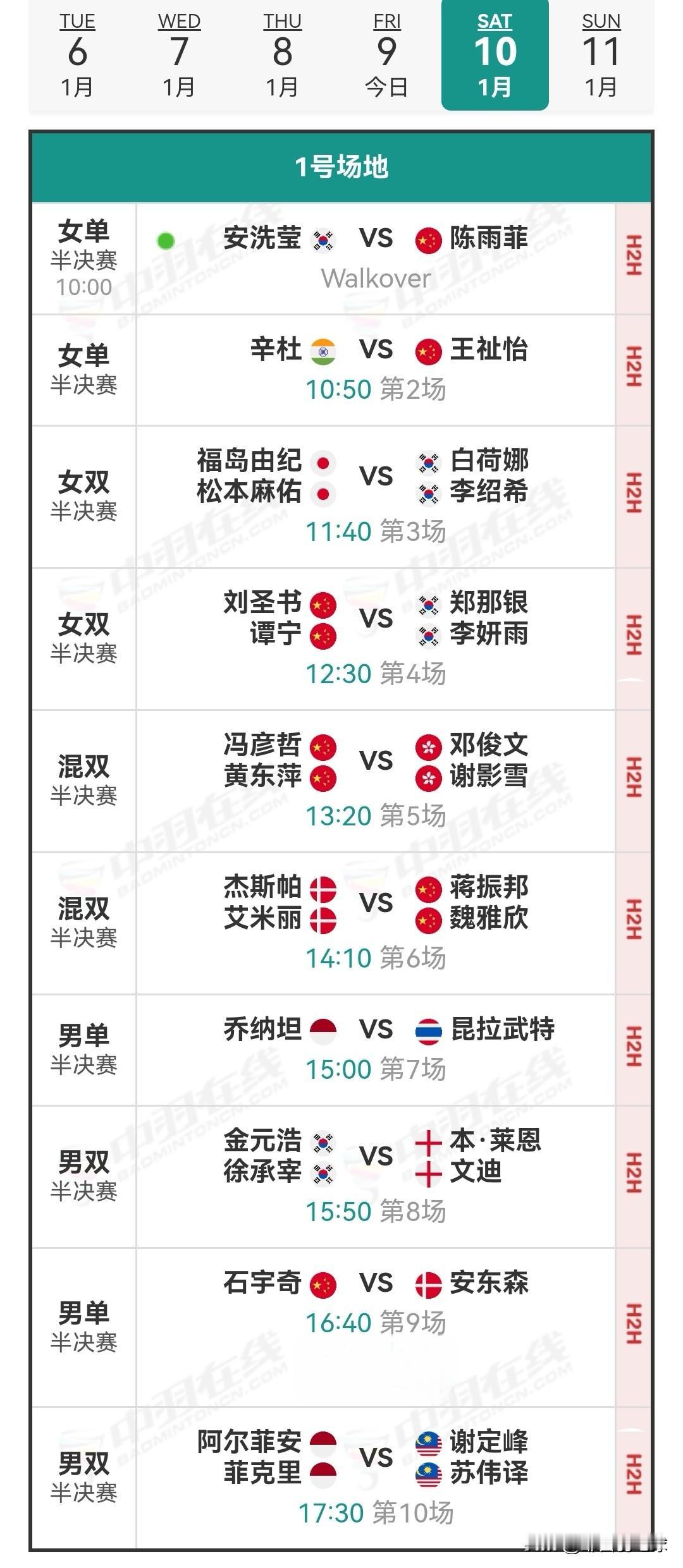 1月10日马来西亚羽毛球公开赛半决赛安排 今日国羽战况6胜1负。石宇奇两局速胜李卓耀,陈雨菲直落两局淘汰因达农,“酱板鸭”组合两局横扫对手,王祉怡激战两局战胜瓦尔达尼,“圣谭”组合同样两局击败日本组合,“凤凰”组合两局战胜队友郭新娃/陈芳卉,他们均成功晋级四强。 明日将进行半决赛,于北京时间10:00开始。明日石宇奇将对战安东森,陈雨菲明天退赛了,王祉怡迎战辛杜,“凤凰”组合与“酱板鸭”组合各守半区,期待他们击败各自对手,成功会师。明日详细对阵安排和今日详细战报如下: 羽毛球 羽毛球爱好者 国羽赛程 羽毛球比赛 羽毛球公开赛 羽毛球赛程 石宇奇 陈雨菲 王祉怡