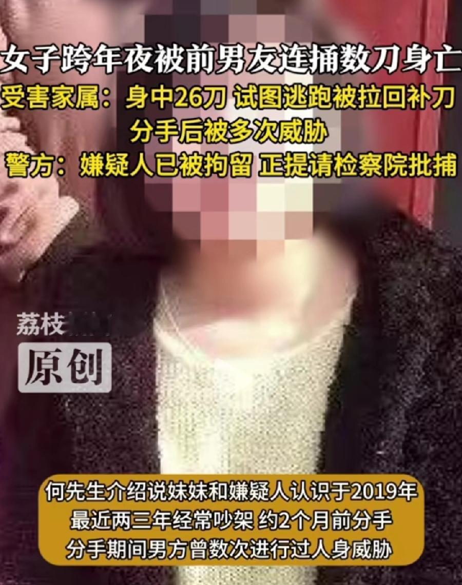 衢州女子跨年夜被前男友捅十几刀身亡,女子表姐透露,表妹33岁,开服装店,前男友姓曹,约40岁,好吃懒做、不务正业,赌博花表妹的钱,二人已经分手几个月,本来当天先约表妹出来吃饭跨年的,她说这几天加班不出来了,结果隔了几小时,(被骗)跟前男友出去吃饭,回家路上被害!事发后曹某自首了! 看报道,曹某多次发微信,到店里威胁要杀女子,长得一看就是没文化街溜子狠人,长相一般般!而被害女子靓丽漂亮,表姐还说表妹大方开朗,为人很好!不知道二人怎么走到一起去的,最后想摆脱都摆脱不掉了!悲剧再次警示每一名女生,找男友一定要看仔细,看学历看家庭,通过细节看人品,不好果断放弃,不要交往太深,否则惹祸上身!