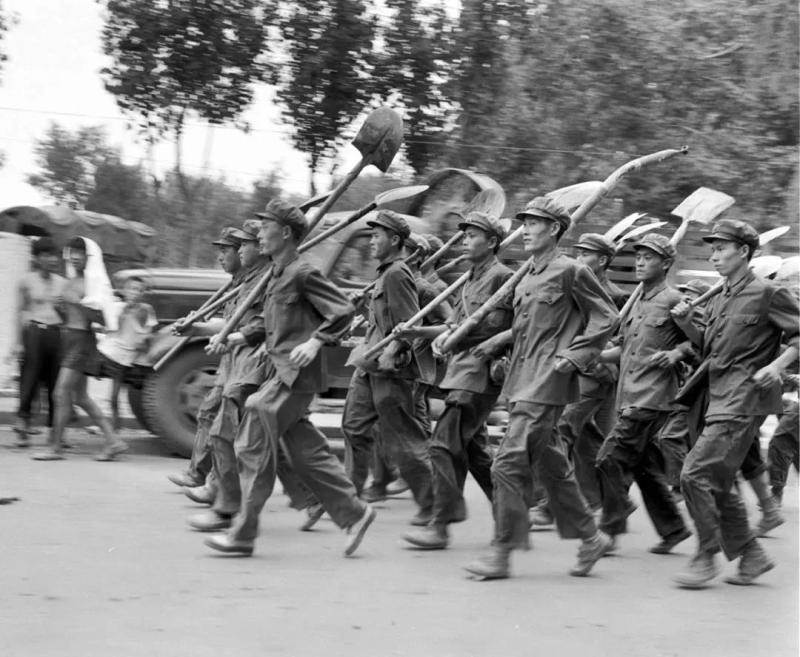 1976年,唐山地震后的黑白照一队解放军战士穿着略显褶皱的军装,每人肩上都扛着铁锹,步伐迈得又大又急,裤脚带起路面的尘土,能看出是刚下运输车辆,就立刻奔赴灾区核心区的状态,路边的群众或驻足让行、或投来目光,藏着震后的焦虑与对救援的期待。 唐山地震发生后1小时内,中央就紧急调派解放军支援,来自北京、沈阳等军区的部队迅速集结,很多战士刚结束日常训练,没顾上准备换洗衣物,只揣着干粮、扛着铁锹就出发。当时灾区交通中断、通讯不畅,部队靠卡车、徒步接力赶路,不少队伍连续行进十几个小时,顾不上吃饭休息,抵达灾区后立刻扑向废墟,用铁锹挖、徒手刨,争分夺秒搜救被困群众,是震后最早稳住灾区秩序的核心力量。