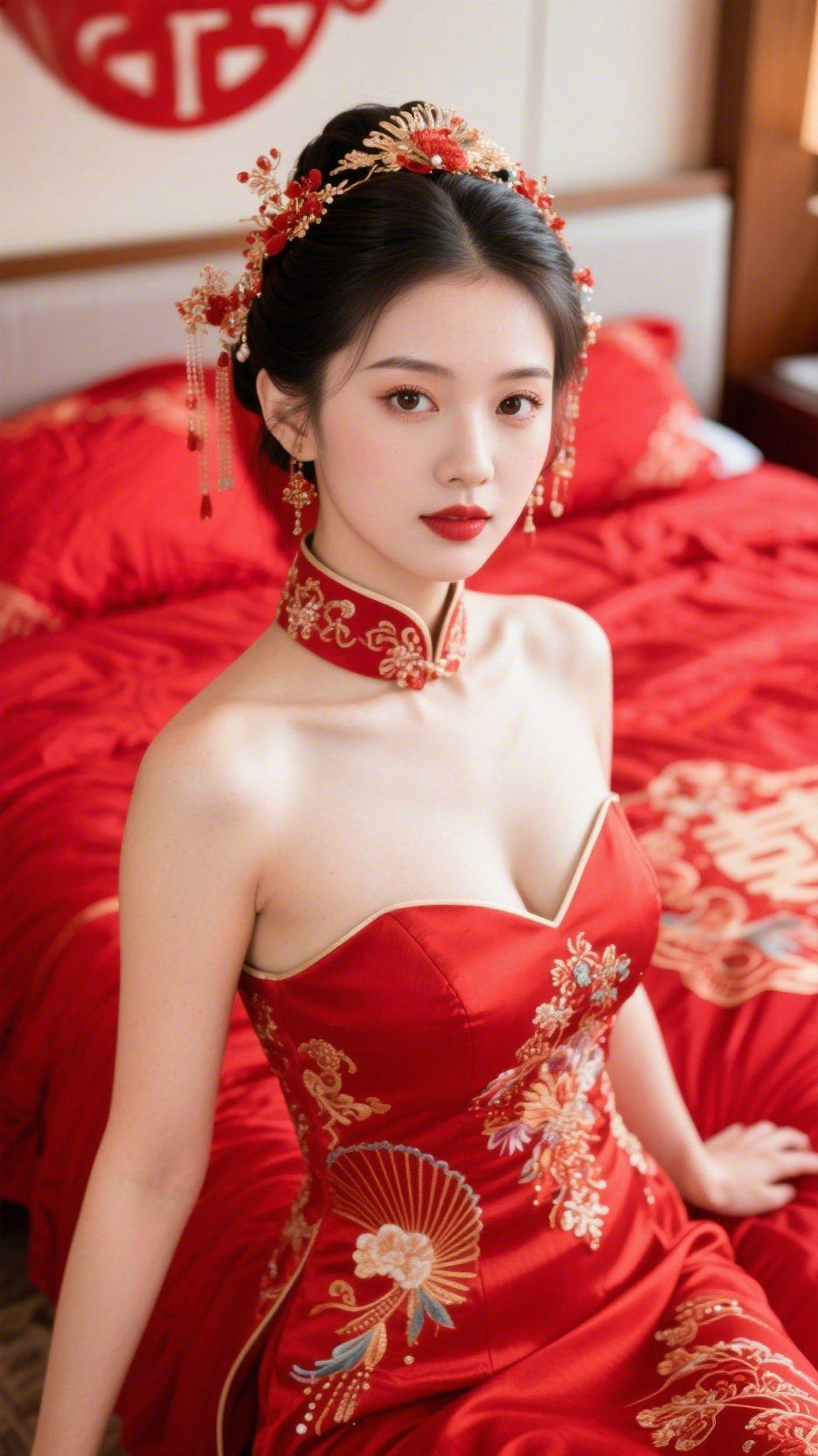 红妆凝韵遇佳期 一袭正红礼裙如霞似火,金线绣制的扇面与繁花在衣身次第铺展,将中式婚嫁的喜庆与雅致,尽数融于细腻针脚。红珠金饰精巧绾起青丝,步摇流苏轻垂耳畔,与颈间红领的绣纹相得益彰,眉眼间漾着温婉的笑意,藏着对未来的满心期许。 背景的红囍字晕开融融暖意,仿佛能听见街巷间的欢歌与祝福,这一刻,红妆不只是华美的装扮,更是对良缘的珍视,对相守岁月的美好憧憬。中式婚嫁的浪漫,向来藏在这些温柔细节里:一抹红的热烈,一针绣的深情,一饰一簪的用心,都让这份幸福,在时光里定格成永恒的美好。 中式红妆 婚嫁氛围感