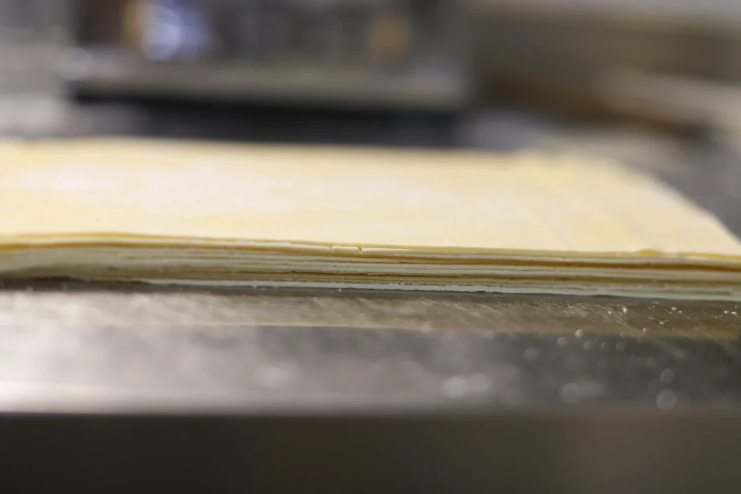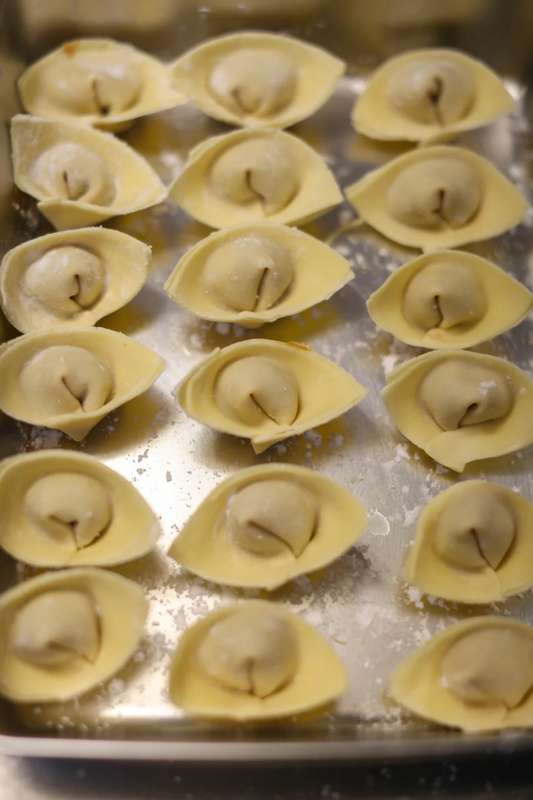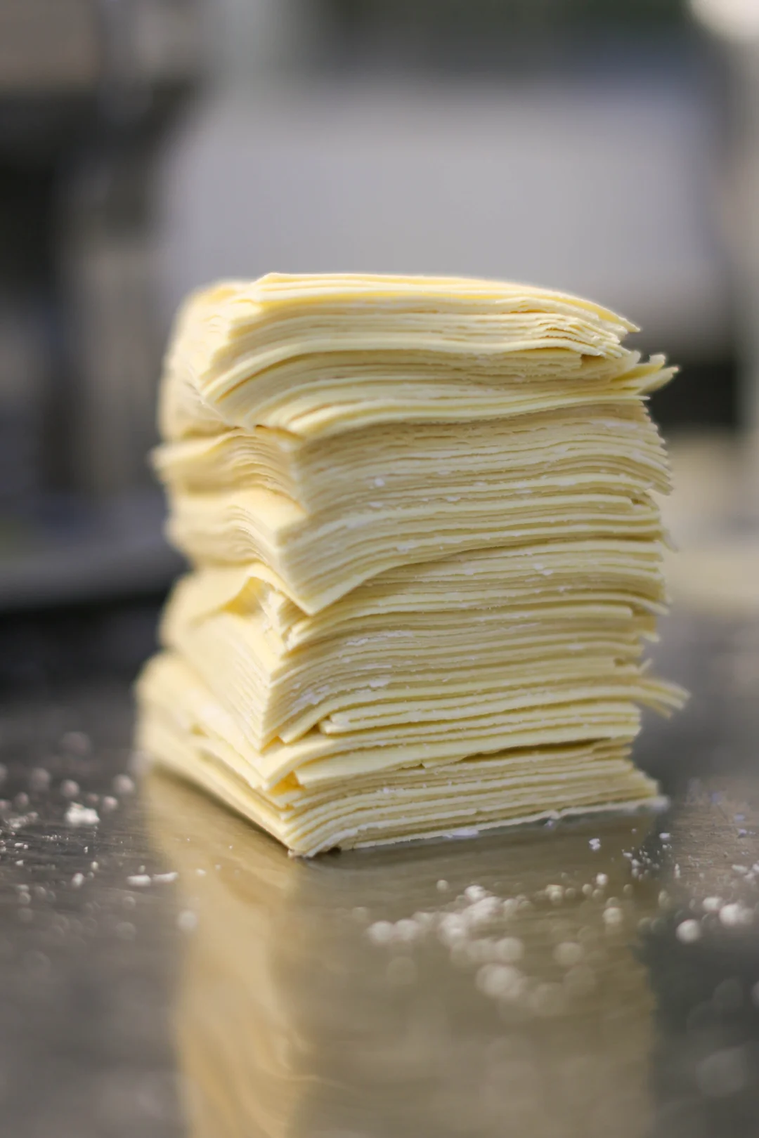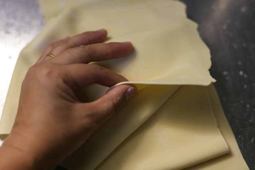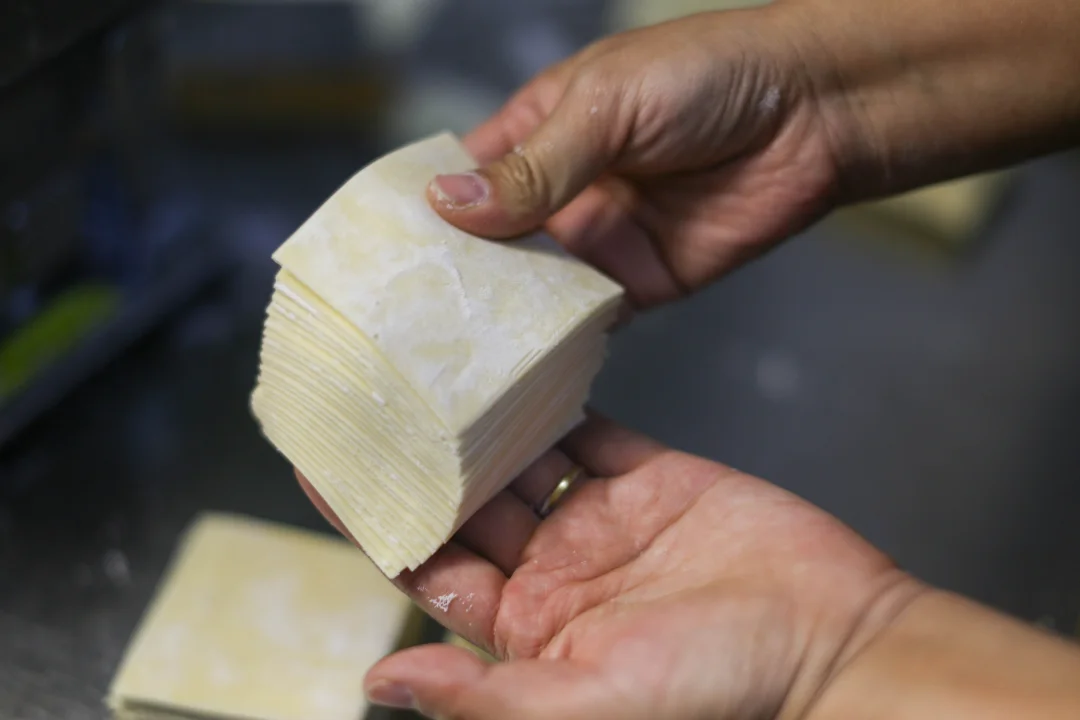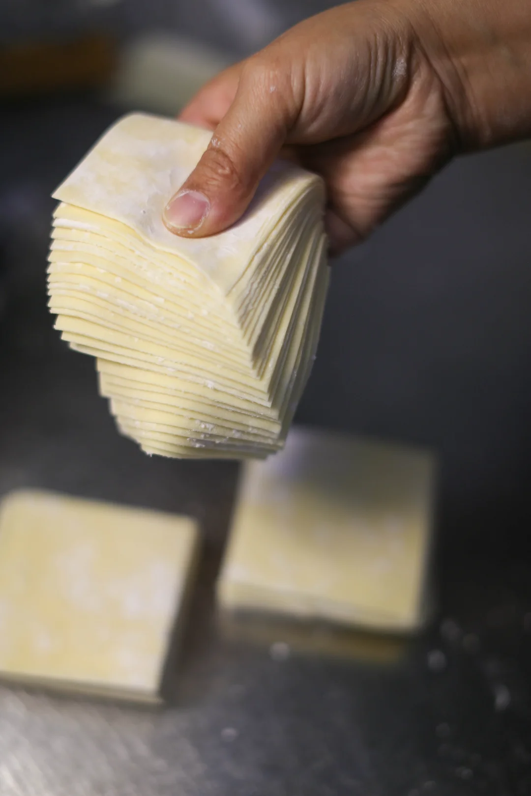 6:拾起一张对着灯,能看见朦胧的光晕,和自己手指的轮廓。这般薄而不破的皮,才能包住清汤里的魂。多余的皮可以撒层干粉叠好,密封冻进冰箱。