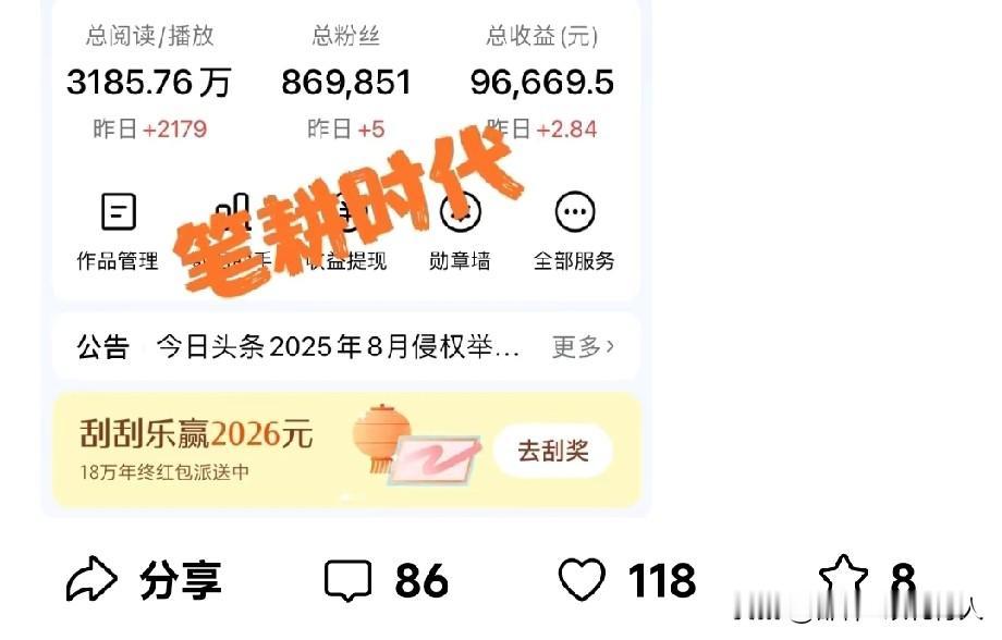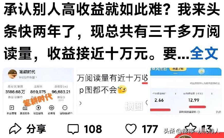 昨天刷头条刷到一位比大伽还厉害无数倍的大神,87万粉丝,据她自己说两年不到在头条赚了十万。 平台总是有人说多互动,各项数据就会好,收益就会高。可这位大神却不是,除了晒收益的作品评论上了百次,大多数为为0到10条。以1至2条居多。我仔细浏览了她的主页截取了25年12月1日一篇作品的评论数据是1,最近12个小时之后的作品评论量也是1,但却没影响她的半毛收益。比那些整天泡在头条互动,几百几千的评论量厉害多了。可怜的盲从者,为了互动而互动,把宝贵的时间用在互动唠嗑上,搞得晕头转向。有人八九年的收益还不及人家两年收益的百分之一,劳苦并不功高。 都说粉丝多,作品有深度、有质量评论点赞就多,与展现、阅读量成正比,相应的就提高了收益。可真不明白,这位大神是怎么突破了“互动”这个瓶颈,创造了收益的奇迹。点开图片看真相,奇与不奇大家评!