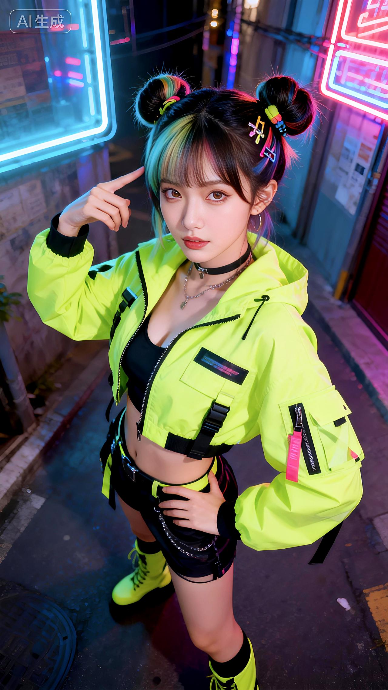 赛博街头酷女孩简直太绝了,冷白皮配上霓虹光影,这皮肤质感简直无敌。就像迪丽热巴出
