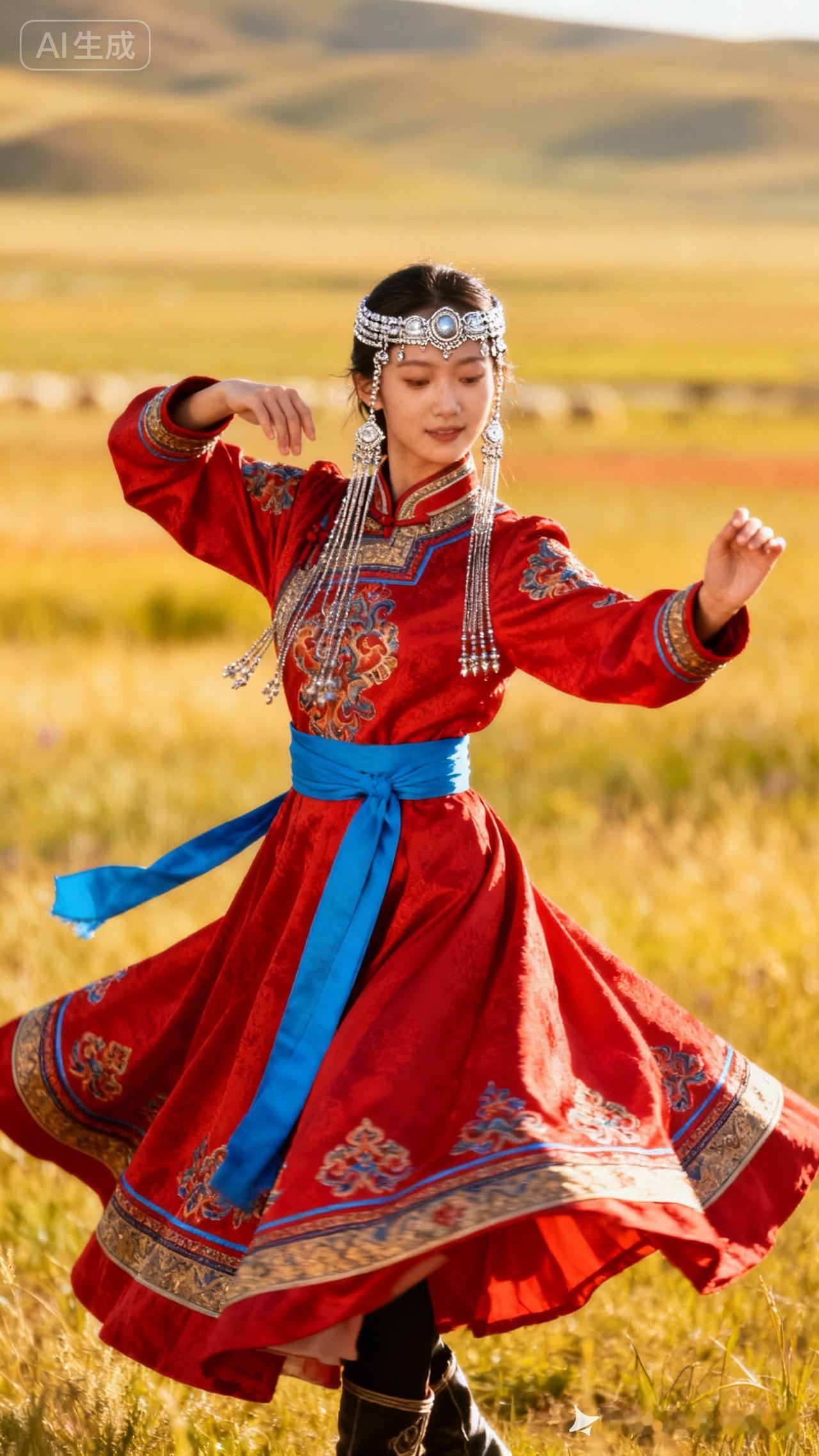 草原上的红衣舞者,裙摆飞扬,尽显民族风情!