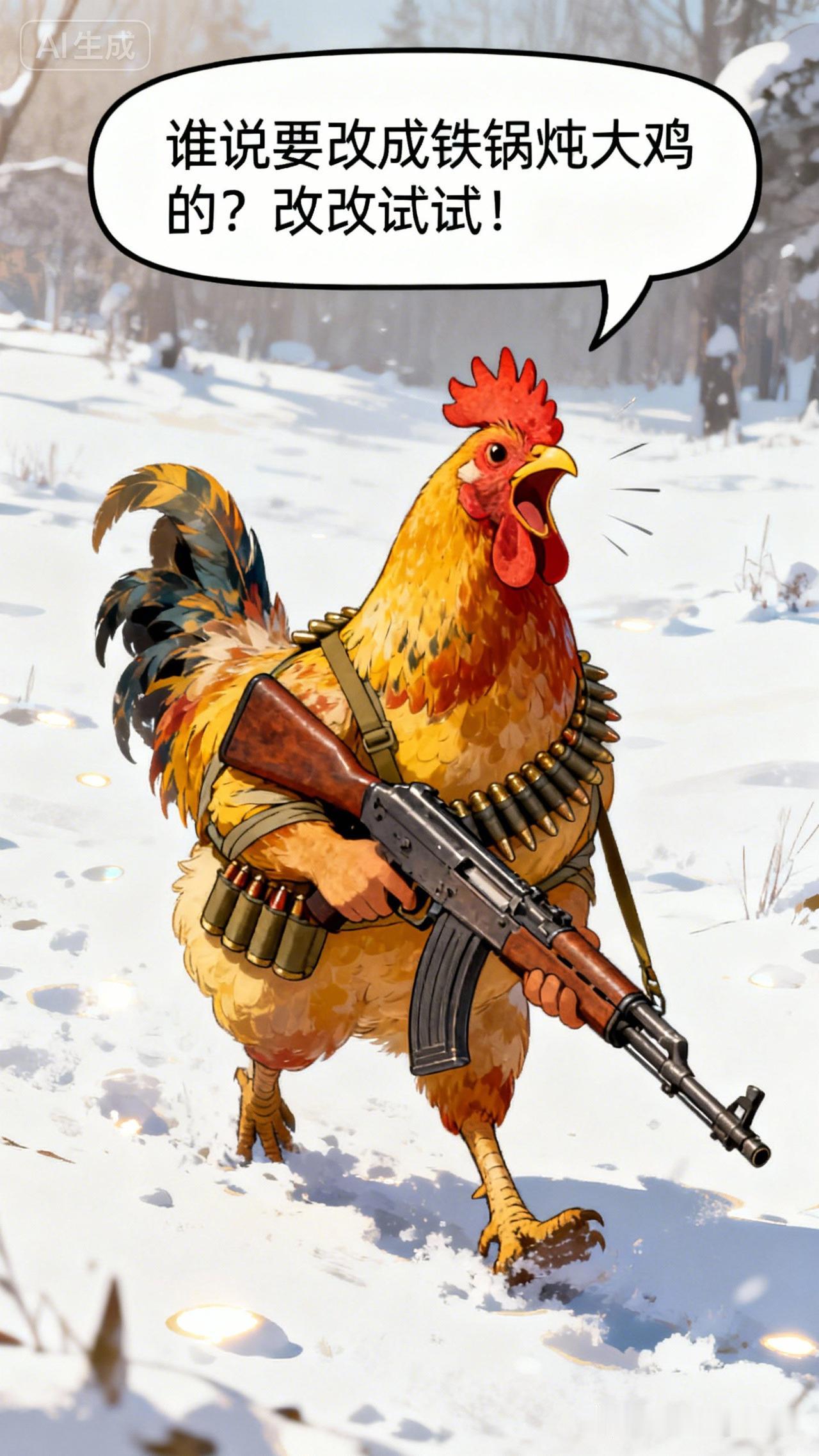 一只持枪的鸡在雪地里大喊。