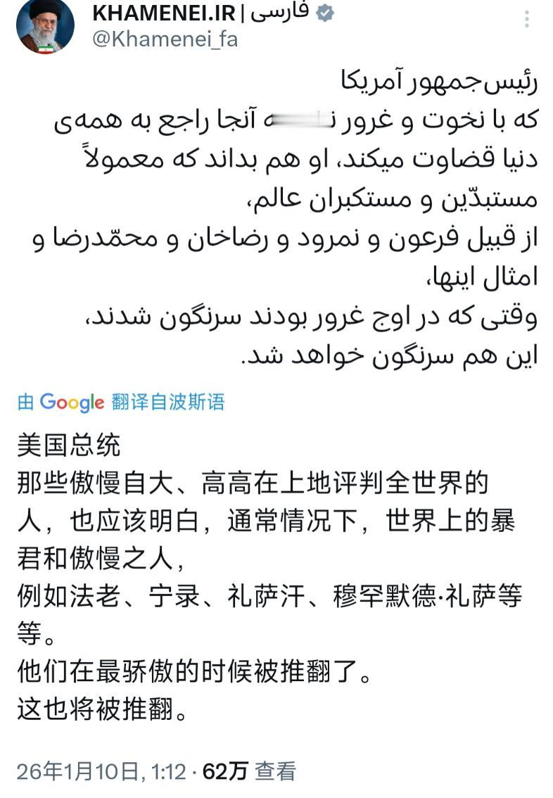 国家有这样长久资历的领导人带领就是不一样!1月10日,伊朗武装部队总司令哈梅内伊发文:“美国总统,那些傲慢自大,高高在上地评判全世界的人,也应该明白,通常情况下,世界上的暴君和傲慢之人,例如法老,宁录,礼萨汗,穆罕默德。礼萨等等。他们在最骄傲的时候被推翻了。这也将被推翻。” 说白了,这就是在警告美国当前的危险行为,同时也是想通过这次的事件吸引国内群众目光,将伊朗现在的内政问题转移视线。 要知道,美国最近不仅对委瑞内拉进行了空袭,跨国将其总统及其总统夫人押出国境,并且还对格陵兰岛有所觊觎,是严重的侵权行为,也赤裸裸的暴露出了美国霸权利益肆意践踏国际规则的真实面目,现在已经引起了众怒,如果其不及时收敛,不仅其他国家会发起联合反制,更会让美国国内陷入政治撕裂、社会动荡的多重困局。 而伊朗现在因为里亚尔恶性贬值与高通胀,正面临全国性集体抗议与社会动荡升级,此时说出这样的话,不仅能缓解其国内舆论压力,还能借助反美这一 “共识旗帜” 凝聚民众立场。 说实话,伊朗这次的发言是一步好棋,既迎合其他国家对美国霸权的不满,又能通过这件事为自身解困。 但说到底,虽然伊朗此番操作能在短期起到内部解压的效果,但终归也只是治标不治本的权宜之计。如果其不能找到真正破解经济困局的核心路径,民众对改善民生的迫切诉求,迟早还是会冲破 “反美共识” 的舆论泡沫,社会动荡的隐患也终究还是会卷土重来。