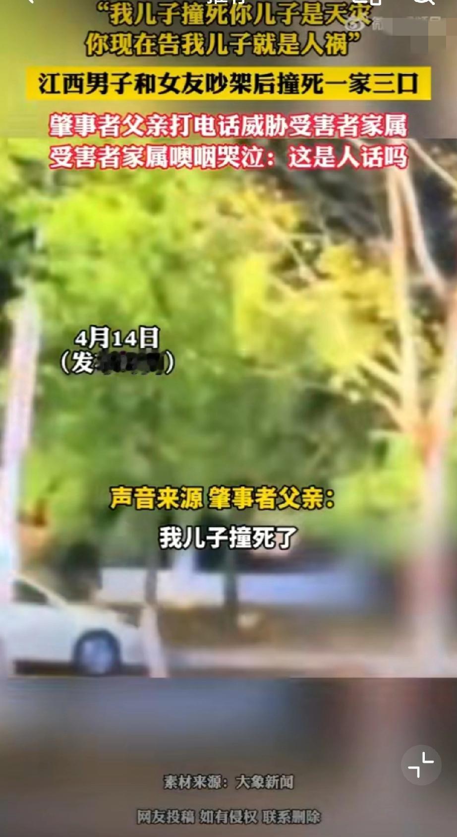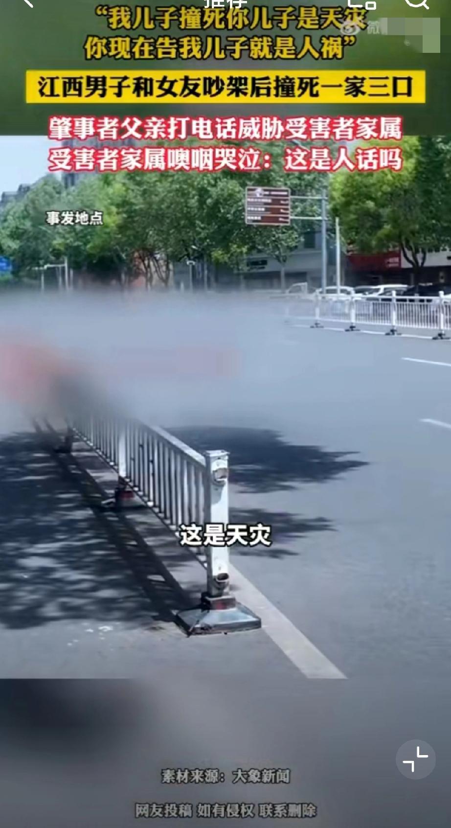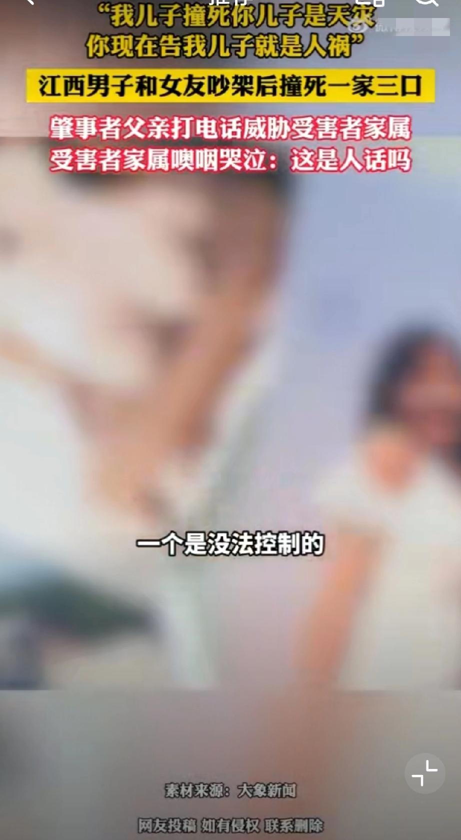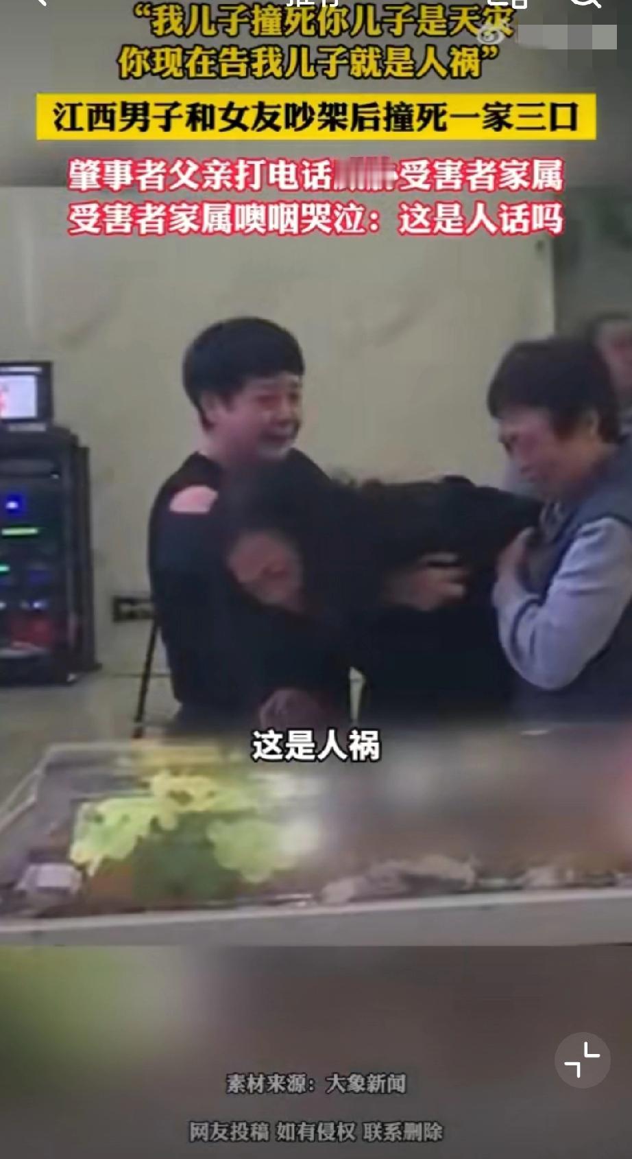 肇事者父亲此前还打电话威胁受害者家属:“我儿子撞死他们是天灾,你现在告我儿子,就是人祸!”真的丧尽天良,一家三口被撞身亡,婴儿被撞得头身分离,夫妻俩一个撞得比车高,一个被撞飞50米!这一切只因和女朋友在车上为“鹦鹉何时开口学舌说话”而吵架的泄火…独子,独女,独孙都走了,剩下一堆老人,你作为肇事者的父亲,还说这么绝情的话,受害者家属该多么崩溃啊!被车撞了赔偿 车祸赔偿流程 交通肇事赔偿案