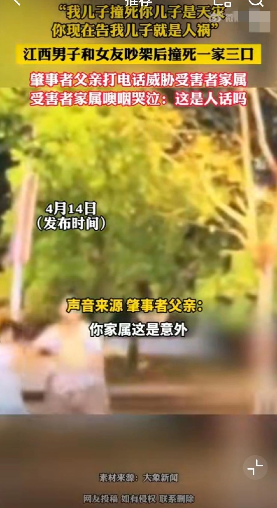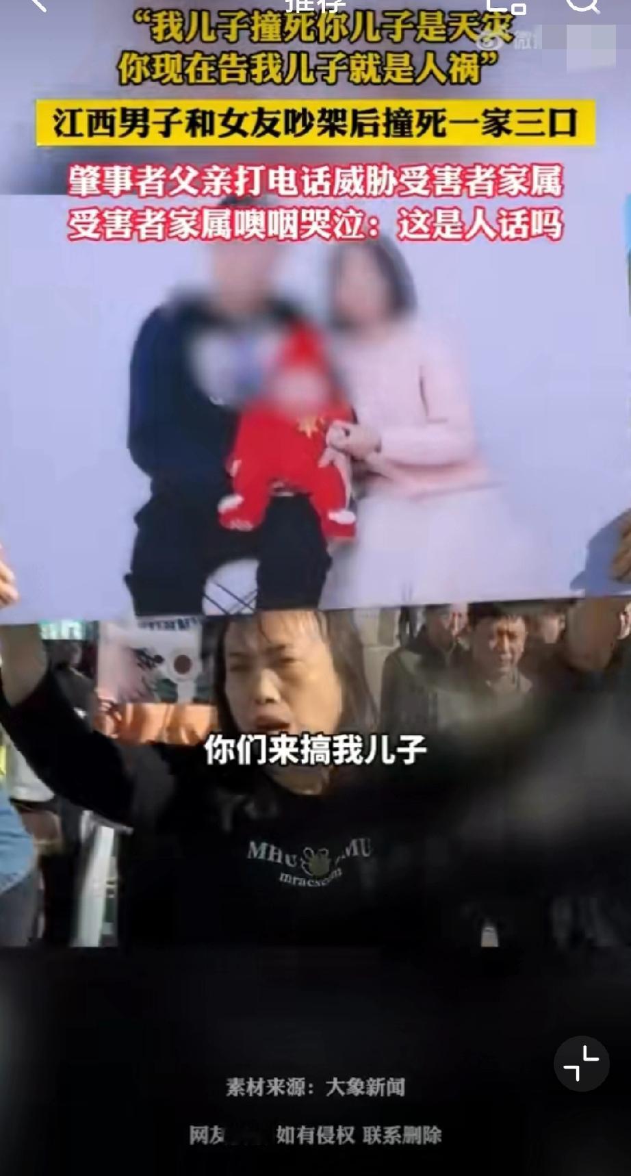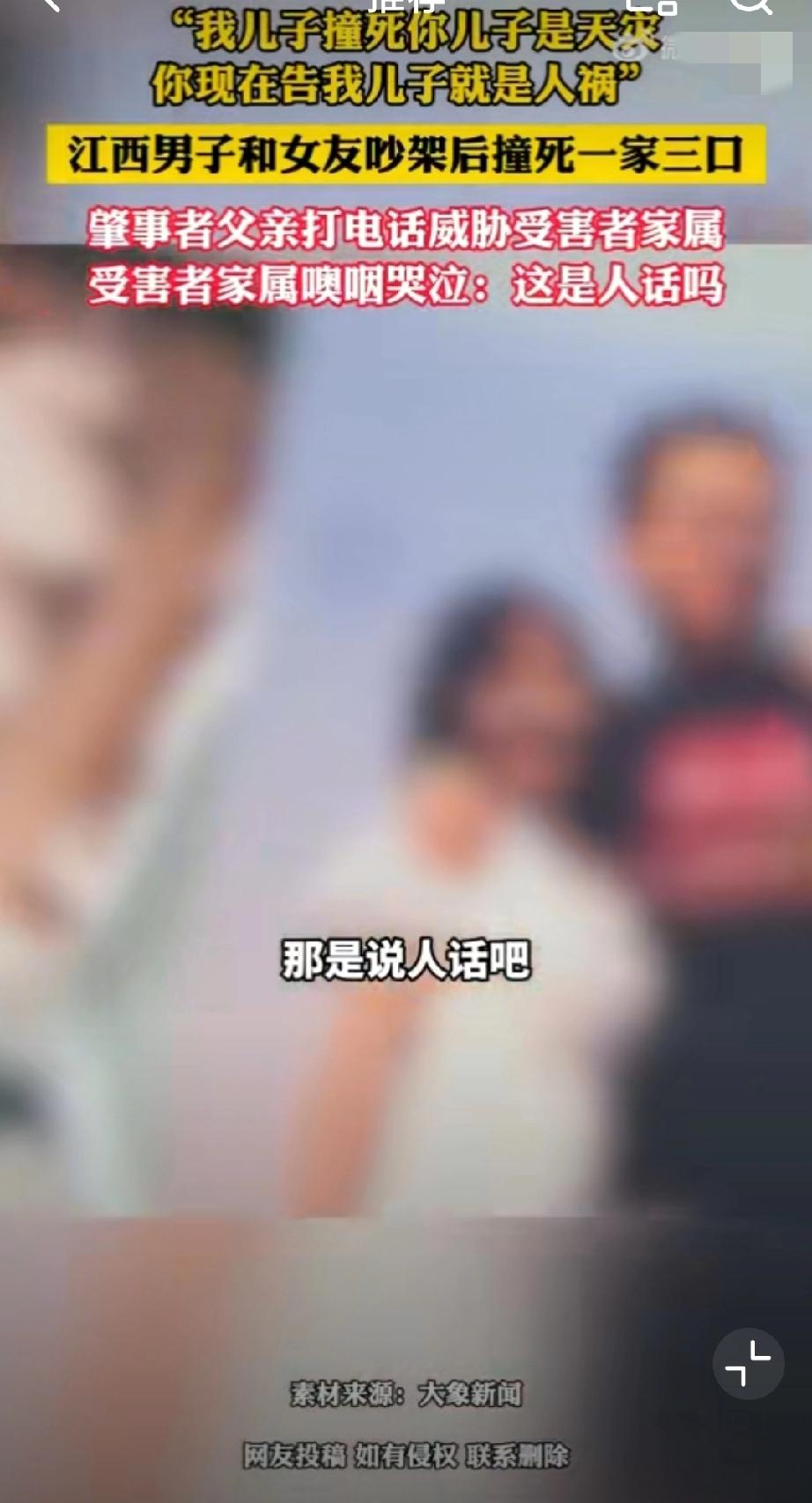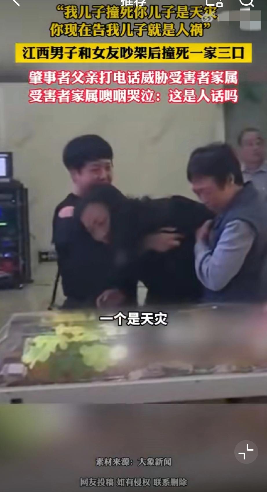 肇事者父亲此前还打电话威胁受害者家属:“我儿子撞死他们是天灾,你现在告我儿子,就是人祸!”真的丧尽天良,一家三口被撞身亡,婴儿被撞得头身分离,夫妻俩一个撞得比车高,一个被撞飞50米!这一切只因和女朋友在车上为“鹦鹉何时开口学舌说话”而吵架的泄火…独子,独女,独孙都走了,剩下一堆老人,你作为肇事者的父亲,还说这么绝情的话,受害者家属该多么崩溃啊!被车撞了赔偿 车祸赔偿流程 交通肇事赔偿案