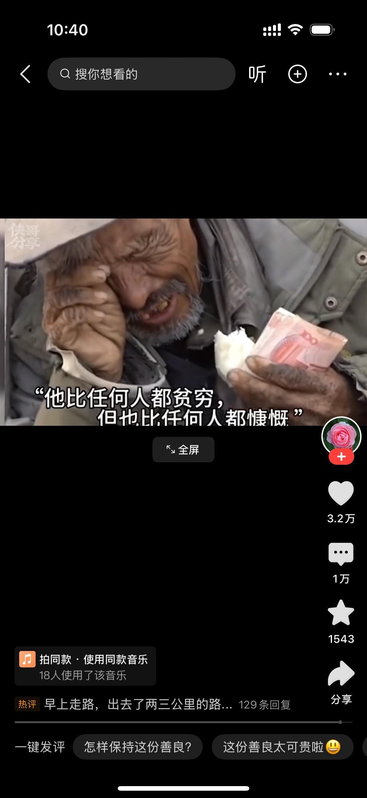 男子看到旁边一位衣衫褴褛的大爷,他假装说自己没钱坐公交车,找大爷要一块钱。大爷没有犹豫,点了点头,把手伸向自己的破衣服内,颤颤巍巍地掏出自己的全部家当,从里面拿出一块钱交到男子手里。男子还不满足,看到大爷仅剩的一个包子说,自己饿了,能不能给他?大爷犹豫了一会,还是把包子给了男子。男子掏出几百块钱放到大爷手里,说这是给你的包子钱。大爷泪流满面,他好久没有感受过这般温暖了。他比任何人都贫穷,但也比任何人都慷慨。