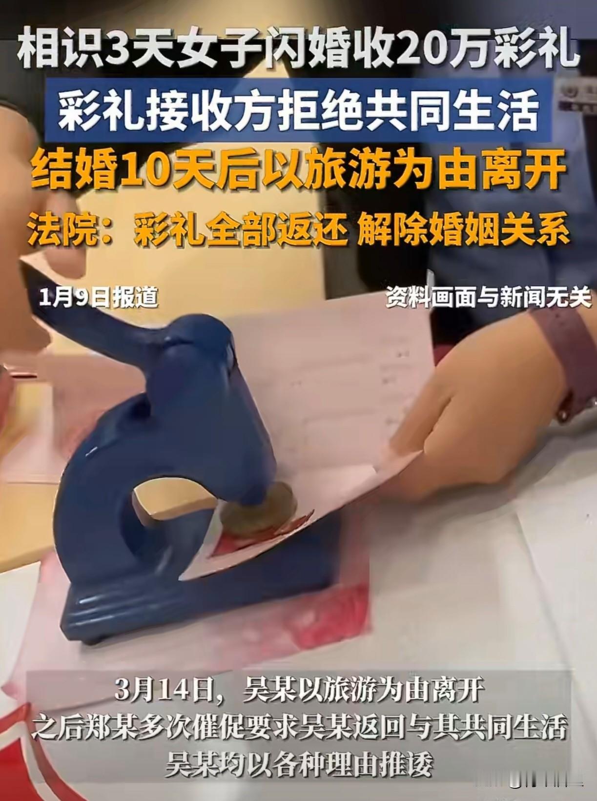最高法最近公布了个案例,真是让我大开眼界。一对男女相亲认识,从见面到领证结婚,总共就花了3天时间。期间男方给了20万彩礼,结果结婚刚过10天,女方就找理由回了娘家,然后说“俩人没感情基础,要离婚”。 拿了彩礼就离婚,没那么简单,男子起诉到法院,法院最后判决准予离婚,但20万彩礼必须全额退还。表示“闪婚”之后拒绝共同生活,这彩礼就得退还。 这判决结果真让人大快人心,法律这回也给那些想靠结婚算计钱财的提了个醒,这条路行不通了。