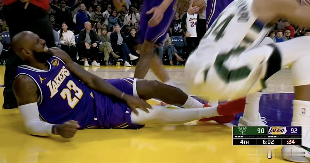 险些受伤!詹姆斯让人泪目! 关键的第四节,东契奇下场休息,湖人队落后9分,詹姆斯临危受命,他先是连得5分帮助球队缩小分差,随后又助攻队友,在他的带领下,湖人队追上了比分。第四节6分02秒,詹姆斯找准时机成功抢断了字母哥,随后迎着两人的防守强硬上篮完成得分,帮助球队反超了比分,直接打停了雄鹿队。但落地时不慎被字母哥压到了腿部,表情非常痛苦。幸好问题并不严重,詹姆斯在缓了一下后起身,直接返回了替补席,并没有返回更衣室。41岁的詹姆斯为了球队拼尽全力,险些受伤一幕让人动容。