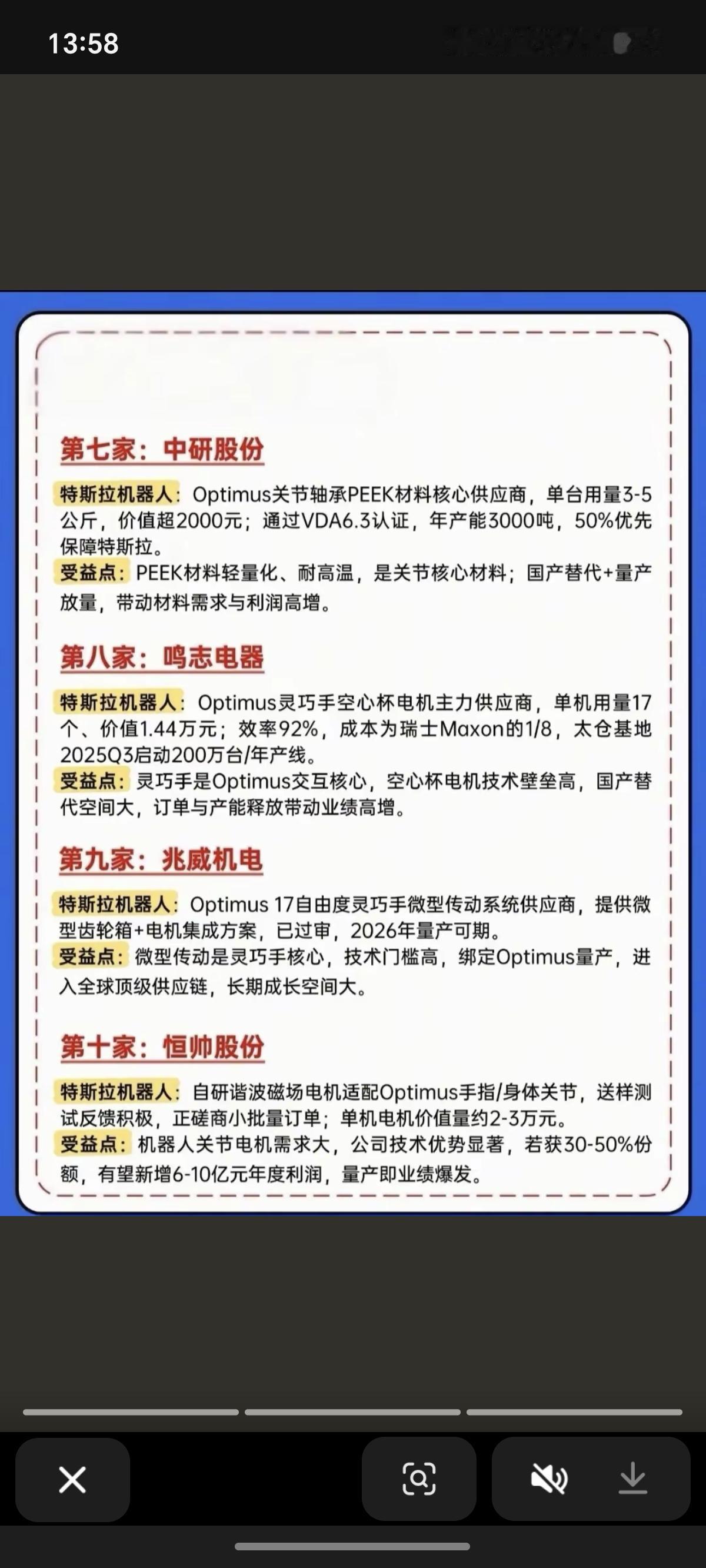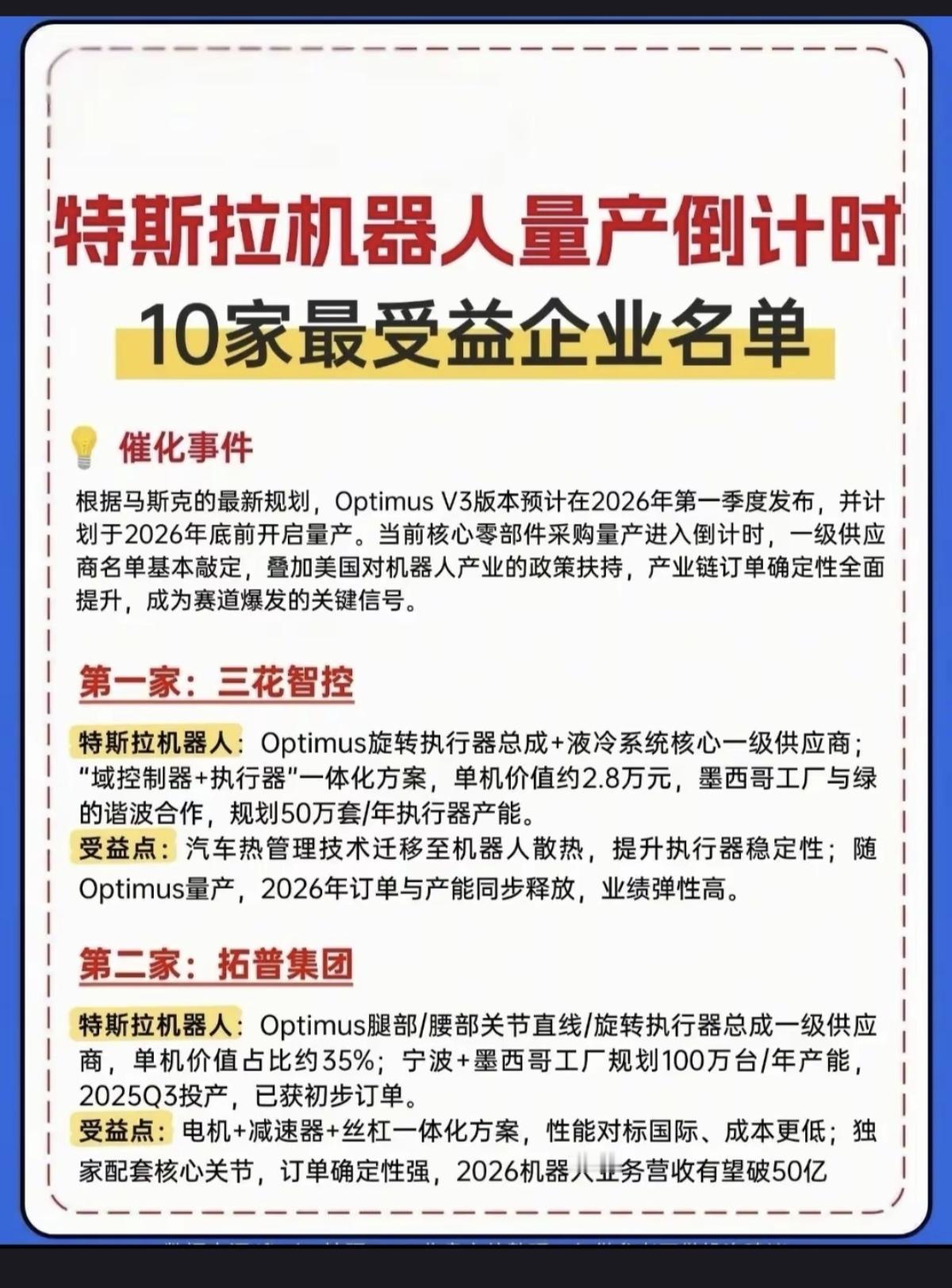 特斯拉机器人:量产倒计时! 10家最受益企业名单! 根据马斯克的最新规划,2026年,特斯拉机器人量产进入正式量产阶段。 相关受益龙头股: