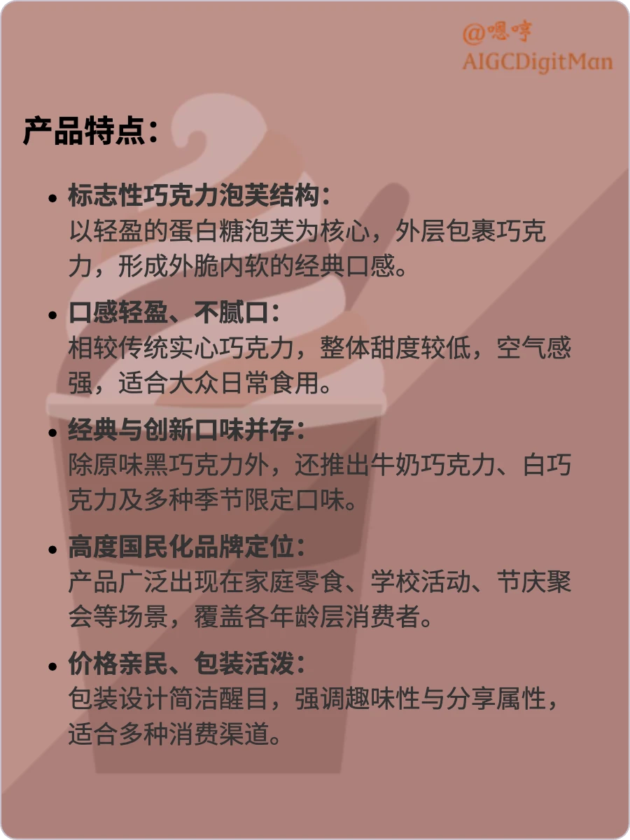 口感轻盈、不腻口: 相较传统实心巧克力,整体甜度较低,空气感强,适合大众日常食用。