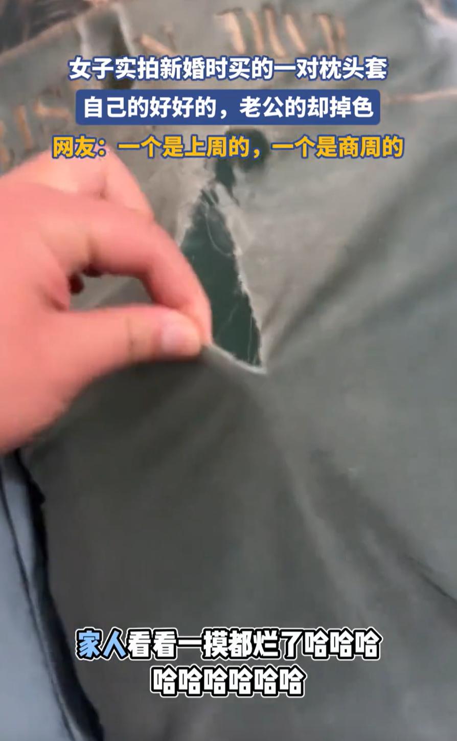 太真实了!一女子在网上晒出自己和老公结婚时的床上四件套,自己的枕头套干干净净的,就和新的一样,可老公的枕套不仅发黄变色,甚至都已经破洞了,网友:一个是上周的,一个是商周的 视频中,女子介绍当时她结婚的时候买了个四件套,自己的枕头看着还沾着点新,除了有些褶皱都很正常,可下一秒镜头转到老公的枕头就画风突变,知道的是老公的枕套,不知道的还以为是刚从垃圾堆里捡回来的 最搞笑的是,老公枕套中间还破了个大洞,女子也是一边止不住的笑,一边把洞给扯开,自己一个人笑得不行 有网友说:我家的也是,枕头毛巾烂的很快,不知道男人为什么那么脏,他的头是钢刷子吧 其实这个事之前就有人科普过,还真不是老公们卫生习惯的问题。很多男性头发短、出油多,每天睡觉时头油、汗液容易渗进枕套里,久而久之布料就容易变质发黄。再加上有些人不注意勤换洗,也不在意这些小细节,一个枕头套能用好几年,可不就成了这副模样 而女性通常更在意床品的整洁和更换,枕套自然保持得新一些。这倒不是谁对谁错,更像是生活中一种无意识的默契,一个不太讲究,一个默默收拾,日子就这么过了下来 有人说这是男人太脏,其实也不全是。更多时候,这只是生活最本真的状态,真实到让人发笑,也真实到让人感到亲切。家里没有外人,不必时刻精致,那些用得最旧、最破的东西,往往才是日常最踏实的存在