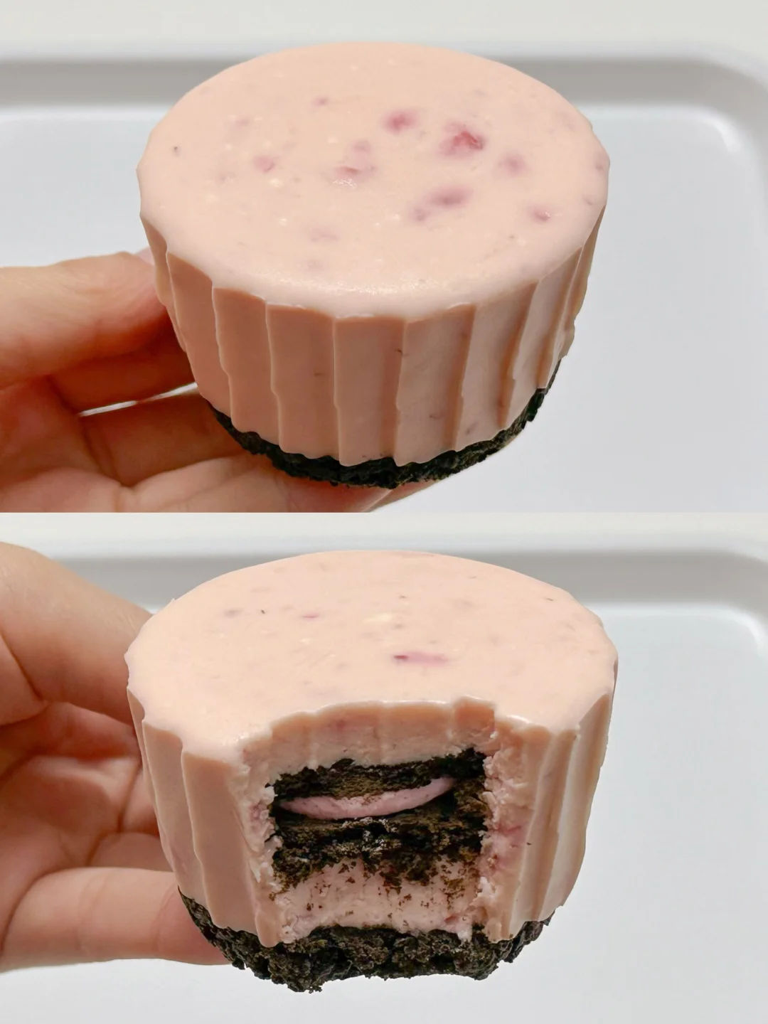 3️⃣将草莓芝士糊挤入纸杯5分满,中间放一块草莓奥利奥饼干,再挤满纸杯,冰箱冷藏4小时左右,凝固后脱模即可。