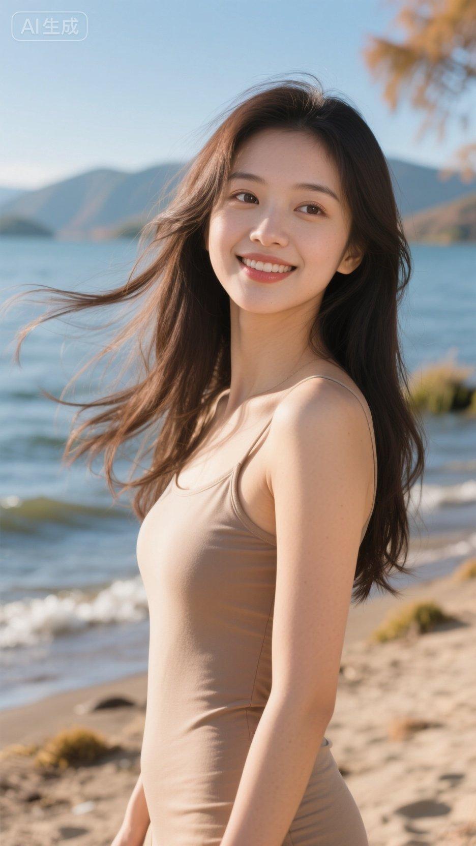海边轻纱遮,笑颜似花娇。海边微笑美影海风美人照海边风照片海滨美人照海边醉