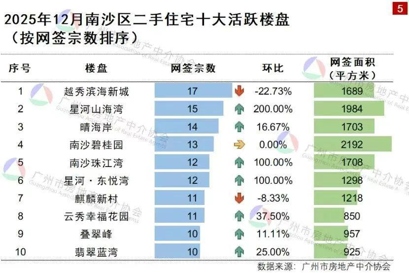 【12月份南沙最好卖的楼盘是ta】广州房中协最新发布了2025年12月南沙区二手住宅市场交易月报,数据显示12月南沙区二手住宅整体网签面积为6.24万平方米,环比增长4.69%;网签宗数为520宗,环比增长7.44%,增长为全市第一名,在广州全市网签整体下跌的情况下,南沙依旧录的增长实属难得。 十大活跃楼盘方面,越秀滨海新城王者回归,网签17宗继续稳守榜首的王座;而南沙湾豪宅楼盘星河山海湾突然暴涨200%,网签15宗位列第二名;比较意外的,晴海岸网签14宗排在了第三名的位置,要知道晴海岸在南沙楼市里面一直都是偏低调的,不知道为什么这两个月以来突然爆发了。南沙碧桂园网签13宗位列第四名,珠江湾也是直接翻翻,网签12套排到了第五名的位置。 而星河东悦湾在还有新盘的情况下,现在二手竟然也起来了,网签12宗排在了第六名。而之前排在前排的麒麟新村则被挤到了第七名。之后依次为云秀幸福花园、叠翠峰和翡翠蓝湾。