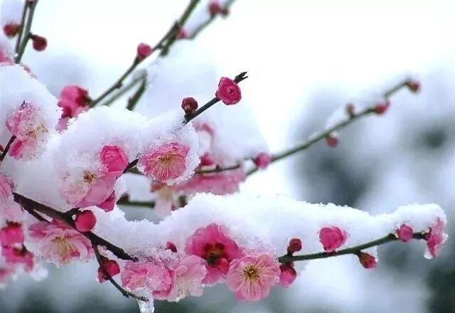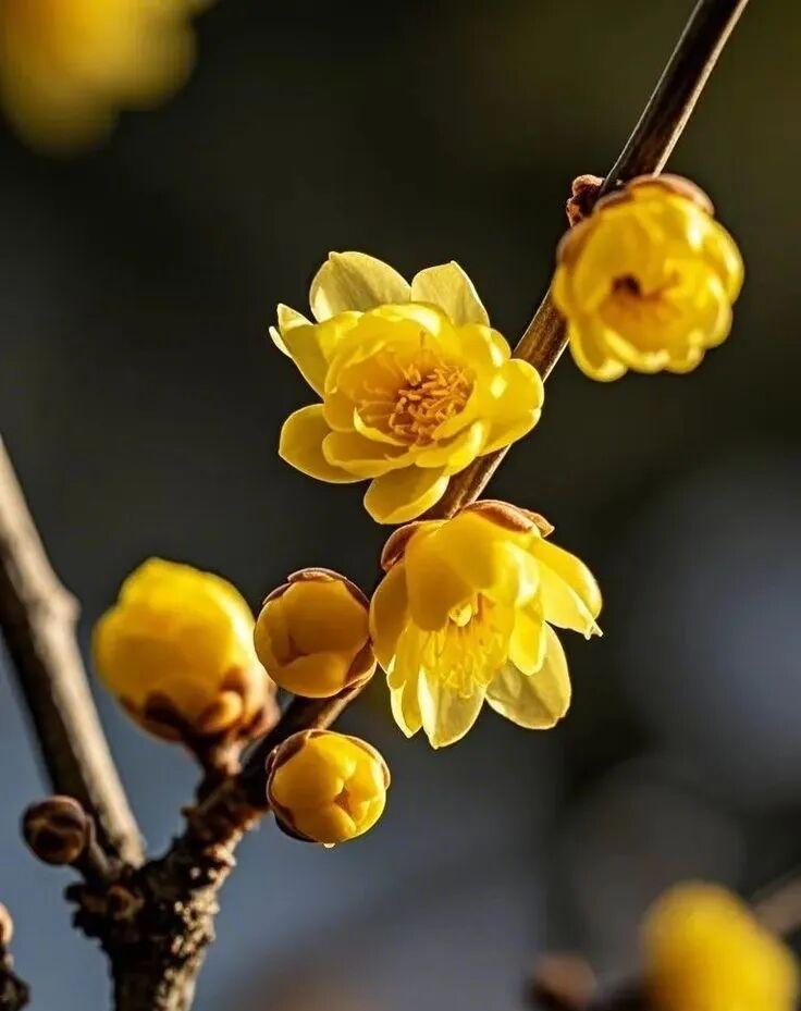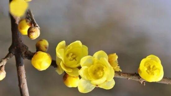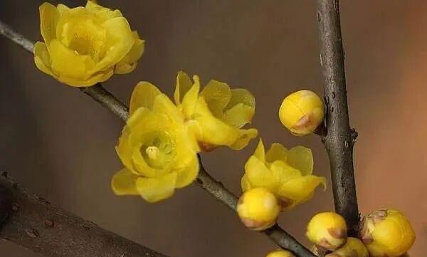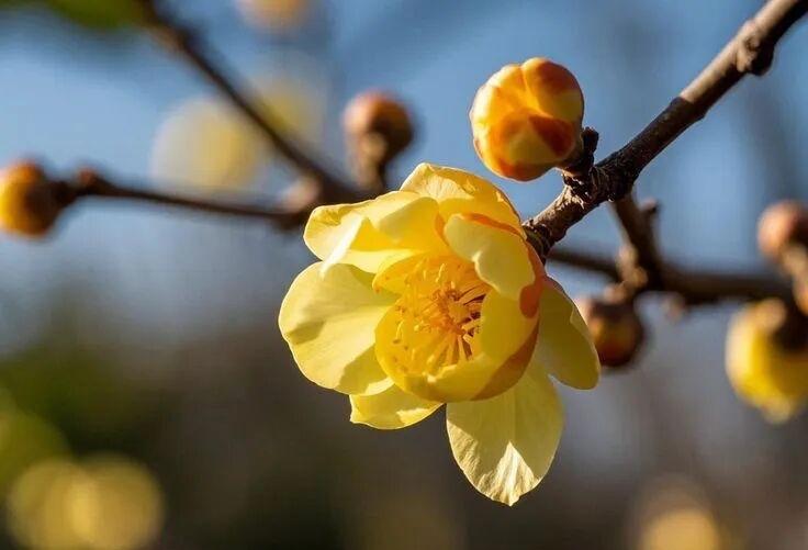 腊梅,冬日的味道 梅花或白,或红或粉,颜色比较显眼,和春天开的榆叶梅很像。而腊梅,花瓣是蜜蜡般的鹅黄,裹着一层薄薄的蜡质,花瓣较硬,而且绝大多数腊梅花都是黄颜色的。 腊梅开花时通常没有叶子,因为它是落叶灌木,到了冬季叶片已凋落。没有绿叶的衬托,一簇簇小花挨挨挤挤地缀在枝头,反倒生出几分疏朗的意趣。那些含苞待放的小花朵圆嘟嘟的,显得尤其可爱。 (文摘集)