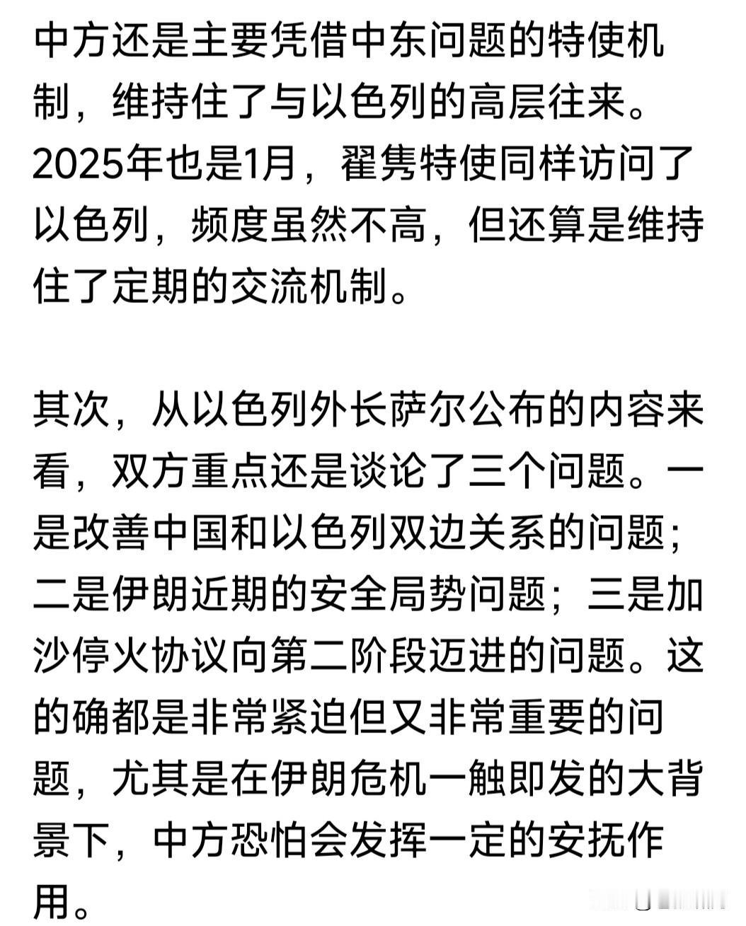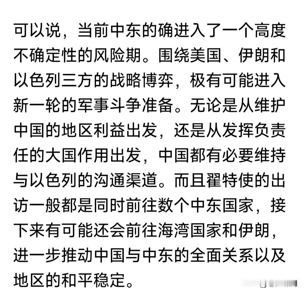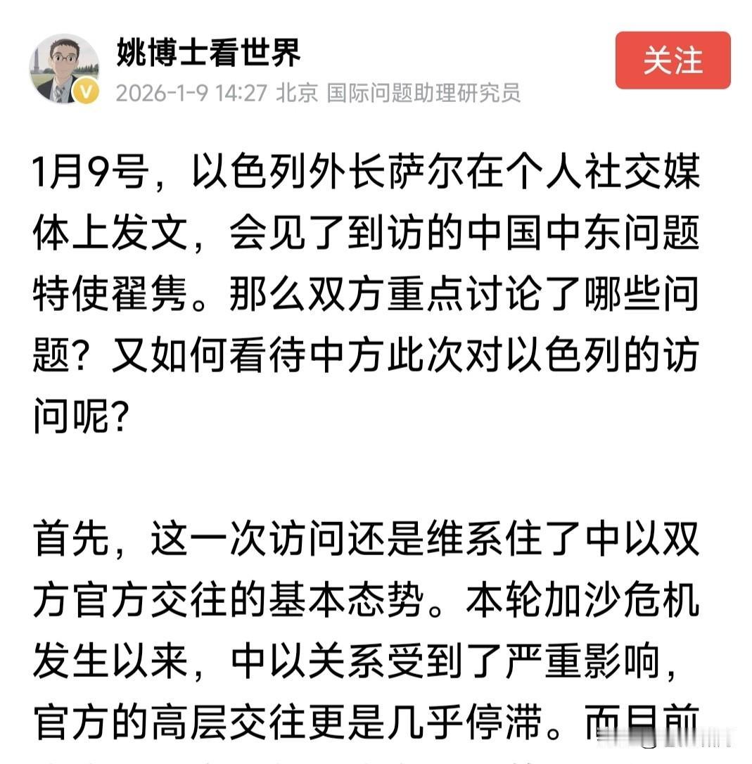 本人一直认为:中以关系是中国在中东最重要关系!中美欧关系是中国在世界最重要关系!中日韩澳是中国在亚洲最重要关系!这些关系处理好,将百利无害,万事皆顺,事半功倍! 当下世界风高浪急!俄乌战争,以哈冲突,美委摩擦,伊狐危机!其实都是两股力量较量,影响着世界发展走向,决定着人类未来福祸。我们在要站稳脚跟掌稳舵,劈风斩浪向前方! …………