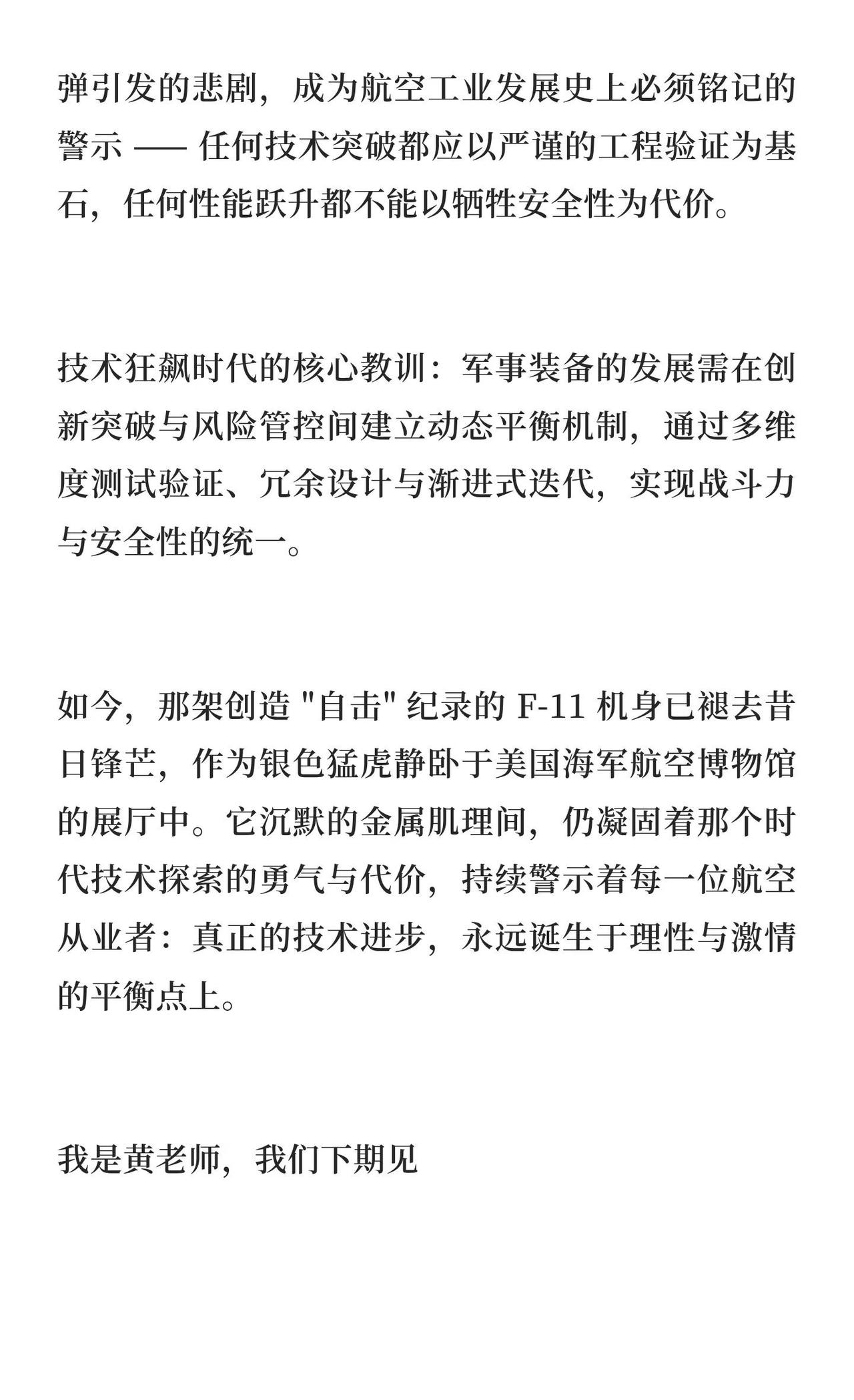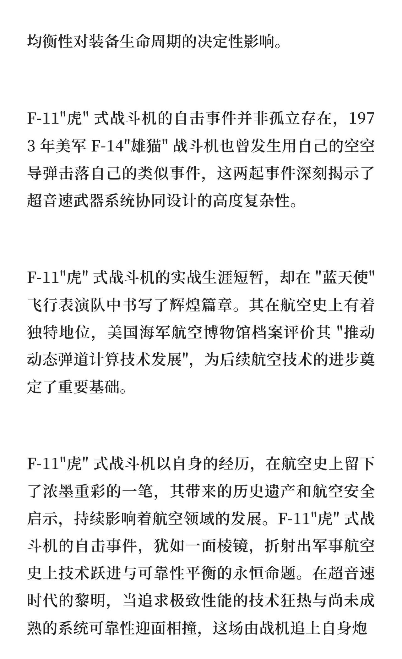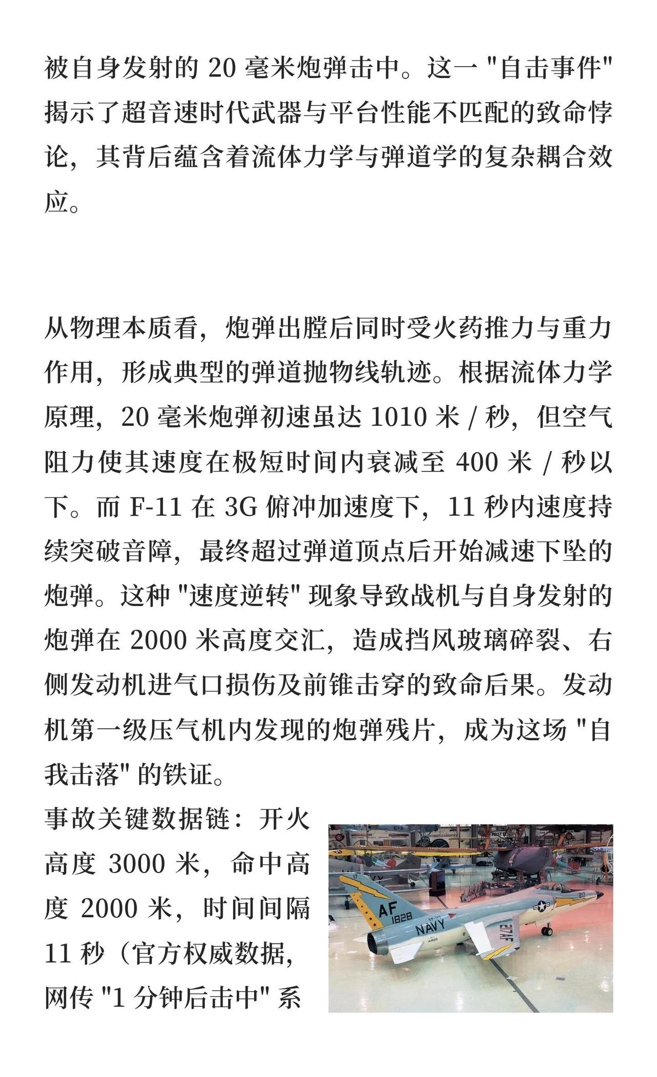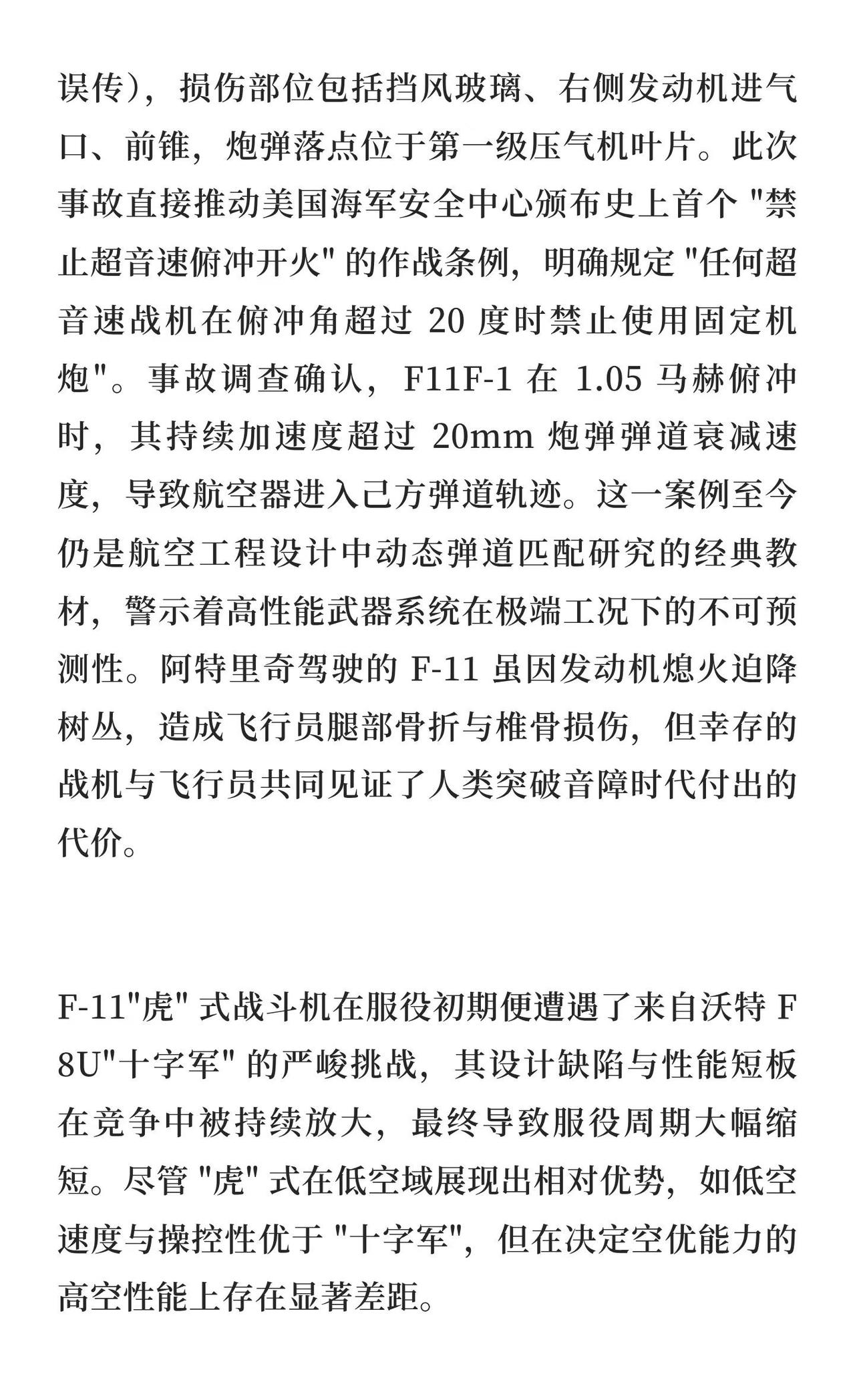超音速悲剧:F-11 “虎” 式战斗机自击事件 F-11“虎”式战斗机因超音速俯冲开火导致自击,揭示了超音速武器与平台性能不匹配的悖论。其设计虽突破音障,但动力系统可靠性问题频发,最终被F8U“十字军”取代,成为冷战初期航空装备快速迭代的缩影。热点 航模黄老师 一起看飞机 航空航天 战斗机 飞机 军事