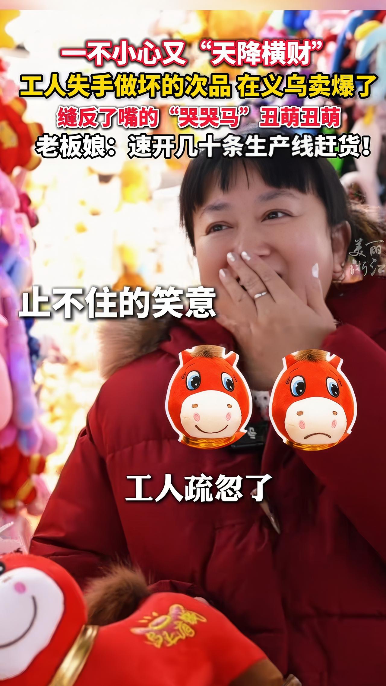 缝反线的哭哭马卖爆了,工人的手一抖,把笑笑马缝成了哭哭马,次品秒变抢手货,商家连夜开了十多条生产线。 义乌一玩具厂工人在赶工时手滑,把偶马的嘴巴缝反了,本该扔进废科堆的次品,结果发货给顾客时当笑笑马发了出去,买家收到货后,看着这个“哭哭马”哭笑不得,这丑萌丑萌的“小哭包”,太扎心了像打工人委屈巴巴的样子,于是把这个有趣的事发到网上,网友看到后纷纷表示好喜欢丑萌丑萌的“小哭包”。 店主大姐刷到后,也是惊喜若狂,没想到工人的失误缝成的小哭包,这么受欢迎,泼天富贵砸到自己身上,连夜喊人加了十几生产线,大姐直呼,再不加线真的要断货了。 我们总是在拼命的追求完美,生怕自己出错,可生活哪有十完十美,你看这个失误反而成的真实的光,哭哭马委屈的小哭包,招人爱一点也不装、不假,太像生活中的自己了,我们天天在焦虑,而有的人,有心栽花花不开,无心插柳柳成荫。 你们怎么看哭哭马,丑萌丑萌的“小哭包”啊?