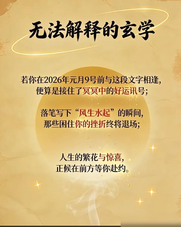 若你在2026年元月9号前与这段文字相逢,便算是接住了冥冥之中好运讯号。 最近在刷到这个带有预言色彩的“好运提醒”,大意是只要动笔写下“风生水起”四个字,那些困住你的挫折就能顺势消散,而前方的繁花与惊喜正等着你去赴约。 我觉得这种仪式感其实是种很积极的心理暗示,在生活不如意的时候,它能帮人按下一个情绪的“重启键”。 算算离2026年初还有挺长一段日子,这个预留出的时间差,其实给了我们足够的余地去把当下的烂摊子一点点理顺。 我挺在意文案里那个“赴约”的说法,它让变好这件事显得特别笃定,好像美好已经在那儿占好了位置,只等我们走过去。 既然冥冥之中遇到了,那就顺势领了这份好彩头,希望接下来的日子真的能顺、顺、顺。