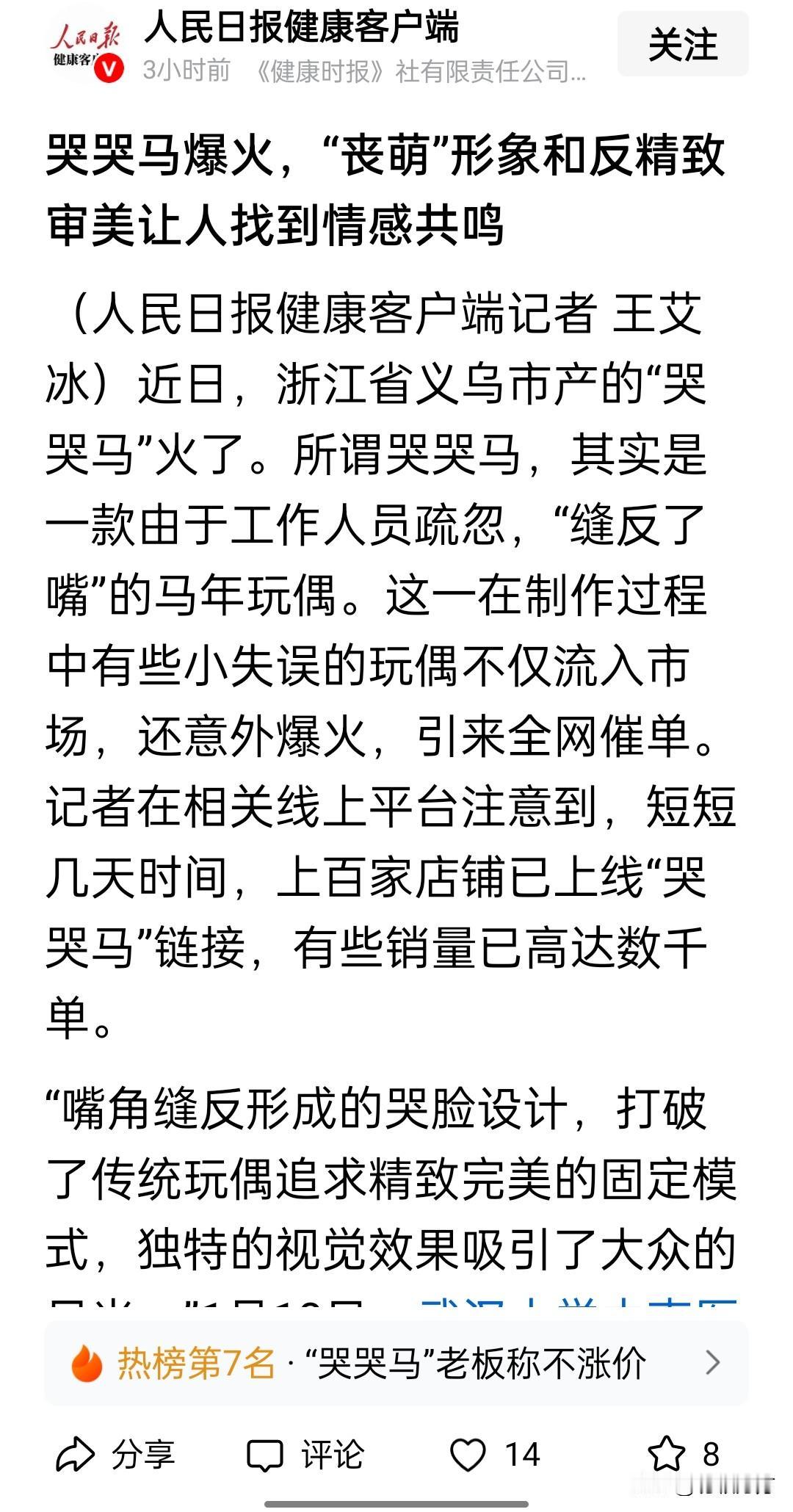 时间进入 2026年,好象是快速滑向了“量子化”时代。新年开始,一座倒立马的造型进入大众视野,设计者寓意为“马到成功”,本想讨个好彩头。没想到却被生拉硬拽到一句脏话上,于是很快被拆除,马倒了,商家却没有“成功”。[大笑] 短短几天过去,又出现了一匹阴差阳错的哭哭马,本来是因为员工的失误将“笑笑马”缝成了“哭哭马”,应该是要被扣钱的,却无意受到消费者的青睐,一时订单暴增,让厂家心里乐开了花。 世界上充满了偶然,是福是祸却不一定,凡人所能做的也就是在机会来过紧紧抓住吧。马到2026年