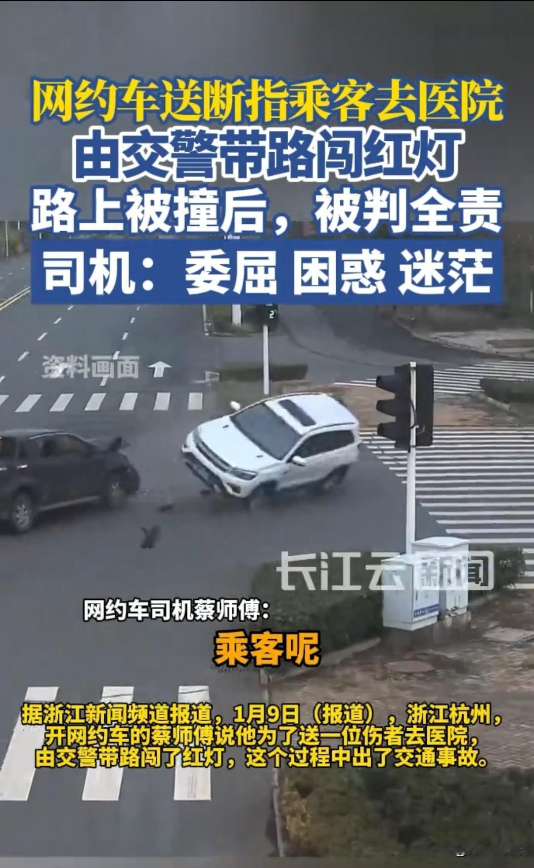 “师傅,救救我!手指断了!”浙江一位网约车蔡师傅接单时,遇上了焦急万分的断指乘客。为抢夺最佳救治时间,他在交警主动带路的情况下闯红灯赶路,不料途中发生碰撞事故,最终竟被判定全责。蔡师傅满心委屈,忍不住直言:是交警示意我跟在后面闯红灯,结果他顺利过去了,我却撞了车,要判我全责?这合理吗? 事发当天,蔡师傅像往常一样接单运营,刚接上这位乘客,就被对方的模样惊出一身冷汗——乘客一手死死按住流血的伤口,鲜血顺着指缝浸透了衣袖,另一手紧紧攥着一个塑料袋,里面装着一截断指,脸色苍白如纸,声音颤抖着哀求:师傅,再快一点,晚了手指就接不上了! 蔡师傅深知,断指再植手术有严格的黄金时间窗口,通常只有6到8小时,每多耽误一分钟,再植成功的概率就会大幅下降,甚至可能导致手指永久缺失。 他丝毫不敢耽搁,立刻启动车辆,同时不停扫视路边,希望能找到交警协调通行。 恰巧前方路口有执勤交警,蔡师傅当即鸣笛示意,摇下车窗大声说明情况:警官,我车上有断肢乘客,急需送医,能不能帮忙通融一下? 交警俯身查看车内情况后,当即做出决定:跟我来!我给你带路,赶紧走!话音刚落,交警便驾驶警车亮起警灯、鸣起警笛,在前方开辟绿色通道,明确示意蔡师傅跟随自己闯红灯行驶。 沿途车辆听到警笛声后,也纷纷主动减速避让,有的甚至直接靠边停车,为救援车辆让出生命通道。 蔡师傅看着前方警车的尾灯,心里既着急又踏实,着急的是怕耽误乘客的救治时间,踏实的是有交警带路,应该不会有违规风险。 他握紧方向盘,全力加速追赶,原本需要半小时的路程,眼看就要大幅缩短,可就在一个十字路口,意外突然发生了——尽管警车已经提前示意,但一辆横向行驶的小轿车似乎没能及时反应,径直与蔡师傅的网约车撞在了一起。 砰的一声巨响,车身剧烈晃动,蔡师傅的额头重重撞到了方向盘上,一阵发麻。 但他顾不上揉一揉疼痛的额头,也顾不上查看自己受损的车辆,第一时间转头问乘客:兄弟,你怎么样?断指没丢吧? 好在乘客系了安全带,只是膝盖轻微磕碰红肿,装着断指的塑料袋也完好无损,并未影响后续救治。 事故发生后,带路的交警迅速停车折返,一边安抚两人情绪,一边安排车,将断肢乘客紧急送往医院,确保救治不受任何影响。 而蔡师傅则被留在现场配合事故认定,看着自己车头凹陷的车辆,再想到后续可能的理赔,他心里已经开始犯嘀咕:千万别出什么岔子,我这可是为了救人啊。 可让蔡师傅万万没想到的是,事故责任认定结果出来后,他竟被判定为全责。 拿着责任认定书,蔡师傅既无奈又委屈,眼眶都红了:当时满脑子都是救急,想着有交警带路,是执行紧急任务,应该没问题,没想到会被撞,还判了我全责。 现在不仅要修自己的车,还要承担对方的损失,我这救人反倒救出麻烦了? 蔡师傅表示,自己从事网约车行业多年,一直严格遵守交通规则,从没吃过违规罚单,这次纯粹是实在心疼乘客的处境,才在交警的明确指引下闯了红灯,没成想会遭遇这样的结果。 网友得知此事后,纷纷展开热议:有人为蔡师傅和交警的果断点赞,为生命让路是美德,蔡师傅冒着风险救人,这份善意不该被辜负; 也有人为他的遭遇抱不平,有交警带路还判全责?这也太不合理了,救人的行为难道不该特事特办吗? 还有人理性分析,紧急避险情况下,责任认定能不能多考虑实际情况,别让好人寒了心。 依据《道路交通安全法》第三十八条,车辆既需按交通信号灯通行,也需服从交警现场指挥,但同时要尽到安全驾驶义务。 按法律规定,开车要守信号灯、听交警指挥,还得保证安全驾驶。横向车辆正常绿灯通行没违规,蔡师傅虽有交警带路,但闯红灯仍要担全责,符合“谁违规谁担责”。 但蔡师傅是为救人才闯红灯,还跟着交警走,不是故意违规。凭交警证明、就医记录能申请免罚或减罚,相关部门会看实际情况处理。 如果不服全责认定,可通过行政诉讼申请重新判定;救人产生的修车等损失,能申请见义勇为补偿,弥补经济损失。 大家认为蔡师傅被判全责,合理吗?素材来源于,长江云新闻2026年1月10日