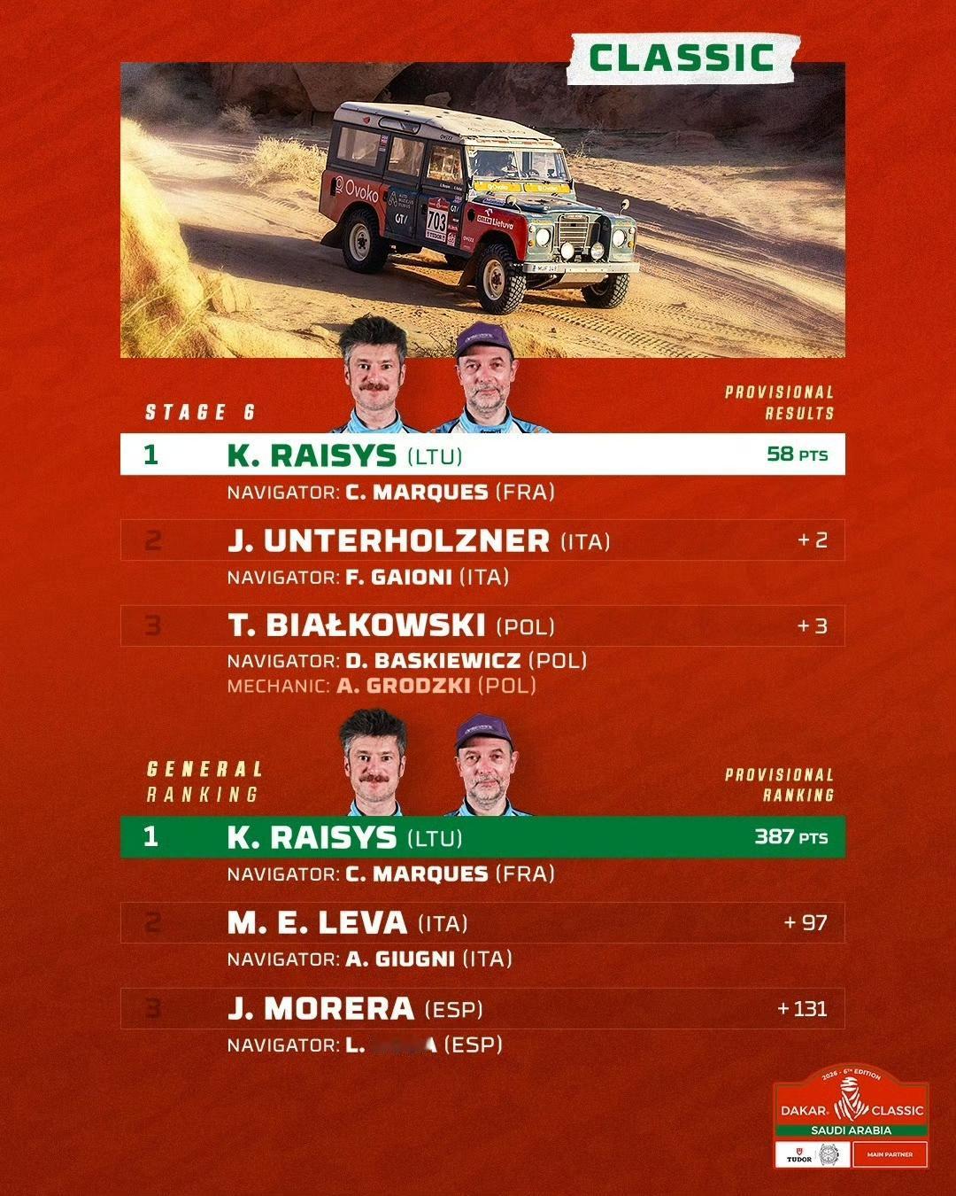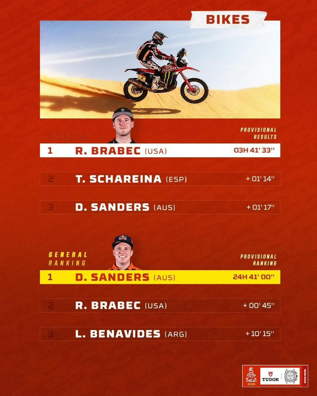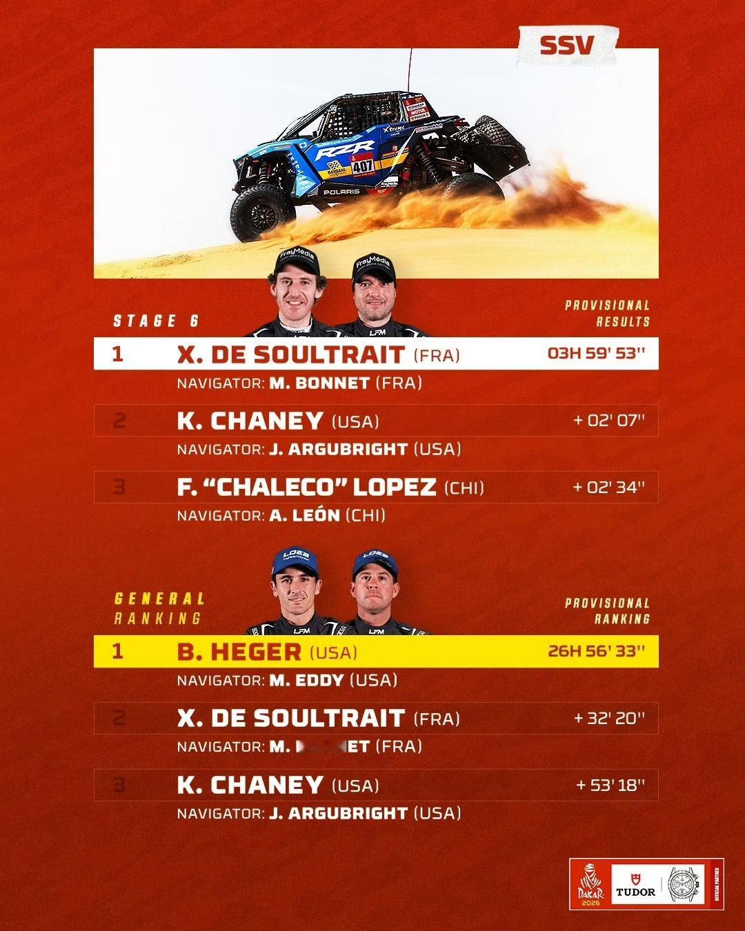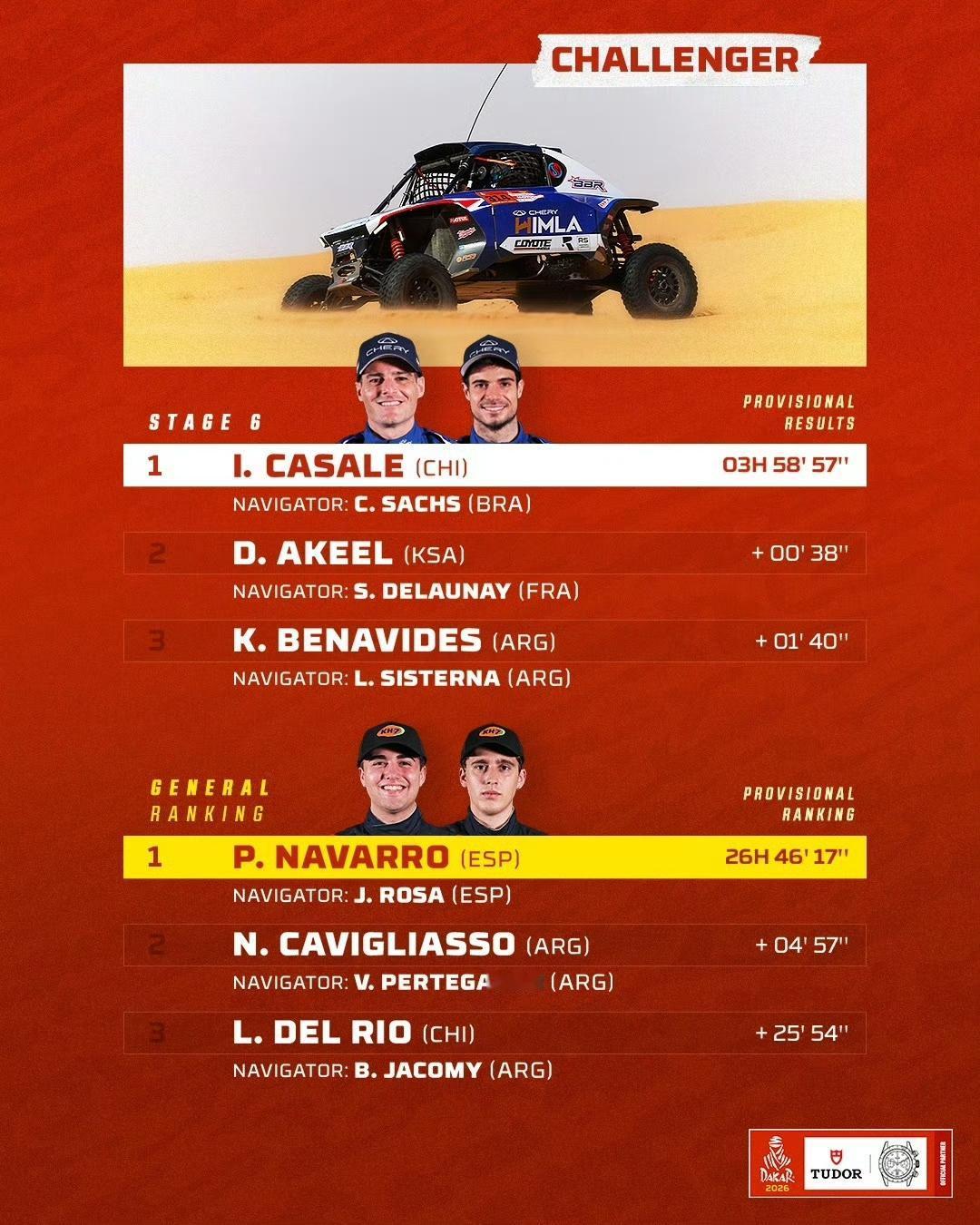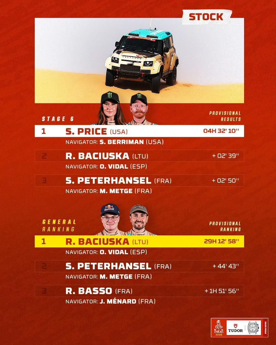 2026达喀尔第6赛段:7个组别成绩单(TOP3) 🚗 T1+组:阿提亚夺个人第49个达喀尔赛段冠军,领跑总成绩 🚘量产T2组:路虎车队再次包揽前三 ,罗卡斯继续领跑总成绩 🏍️摩托车组:布拉贝克赛段冠军,沙丹尼尔·桑德斯领跑总成绩
