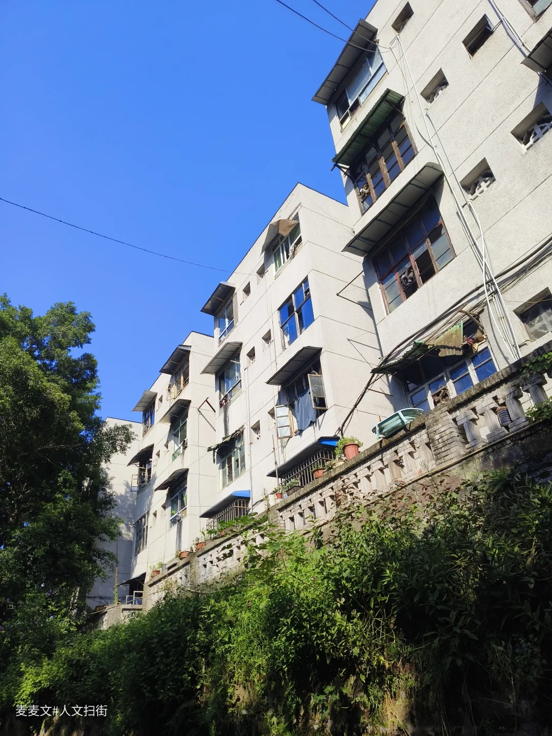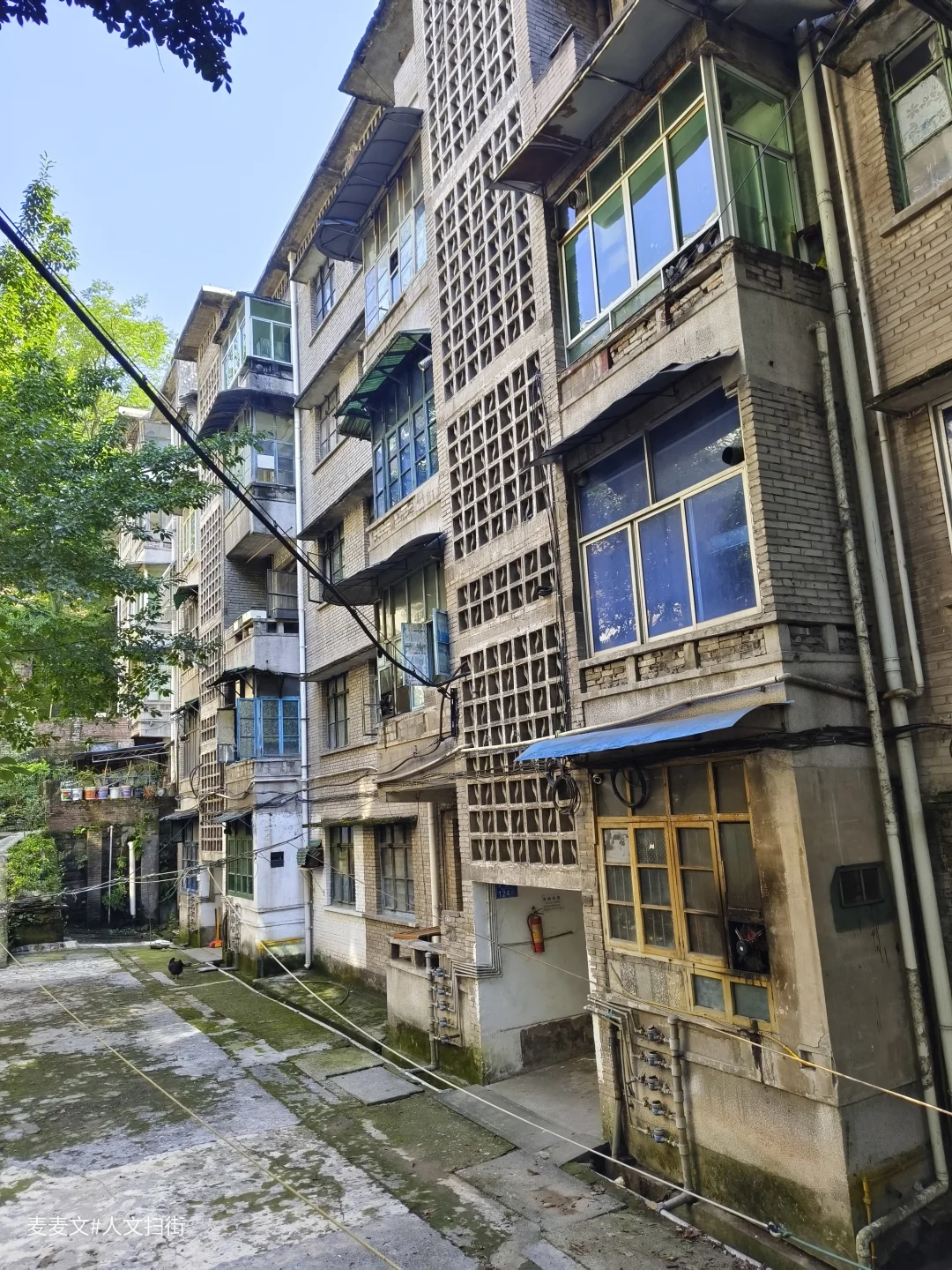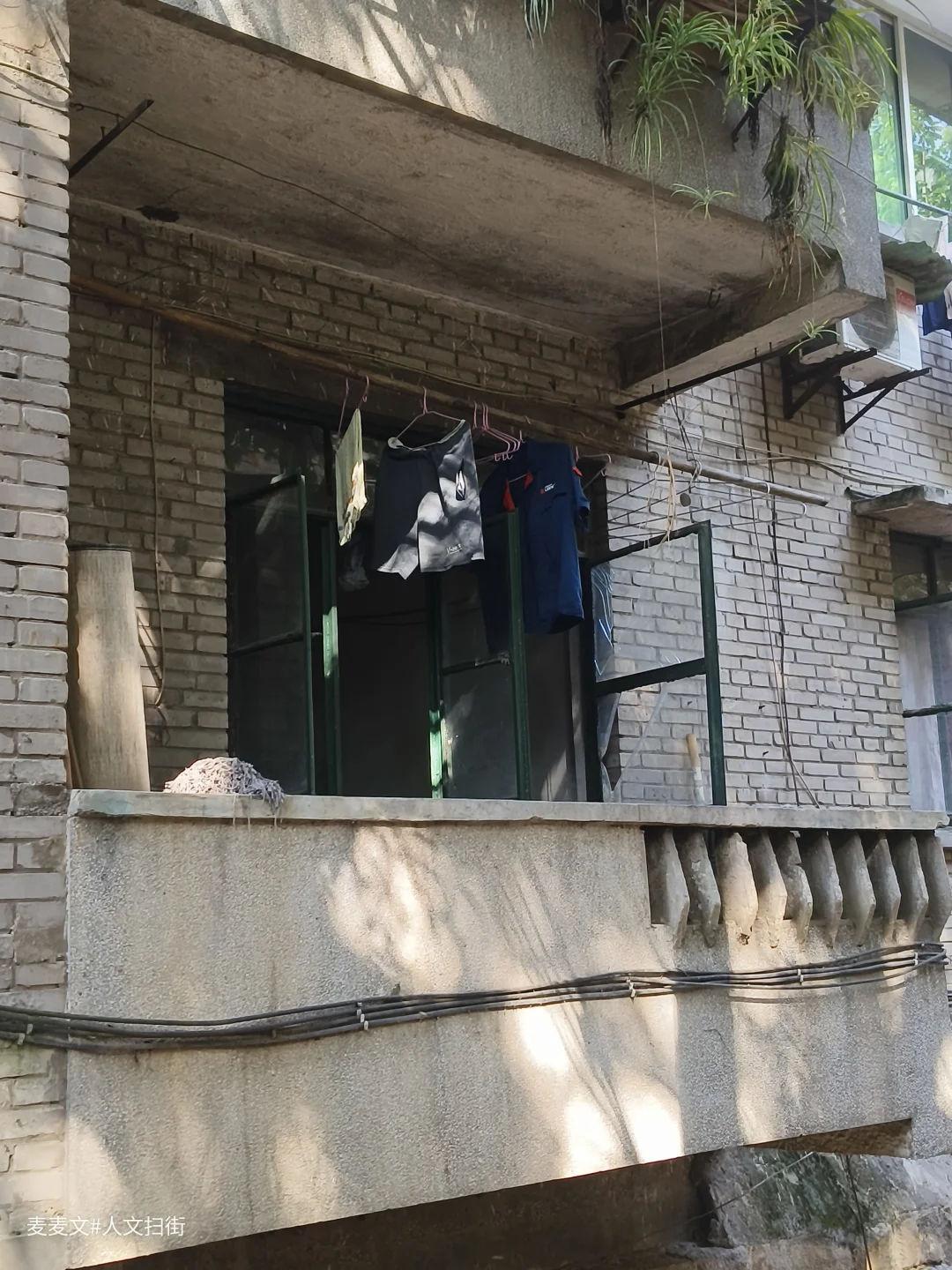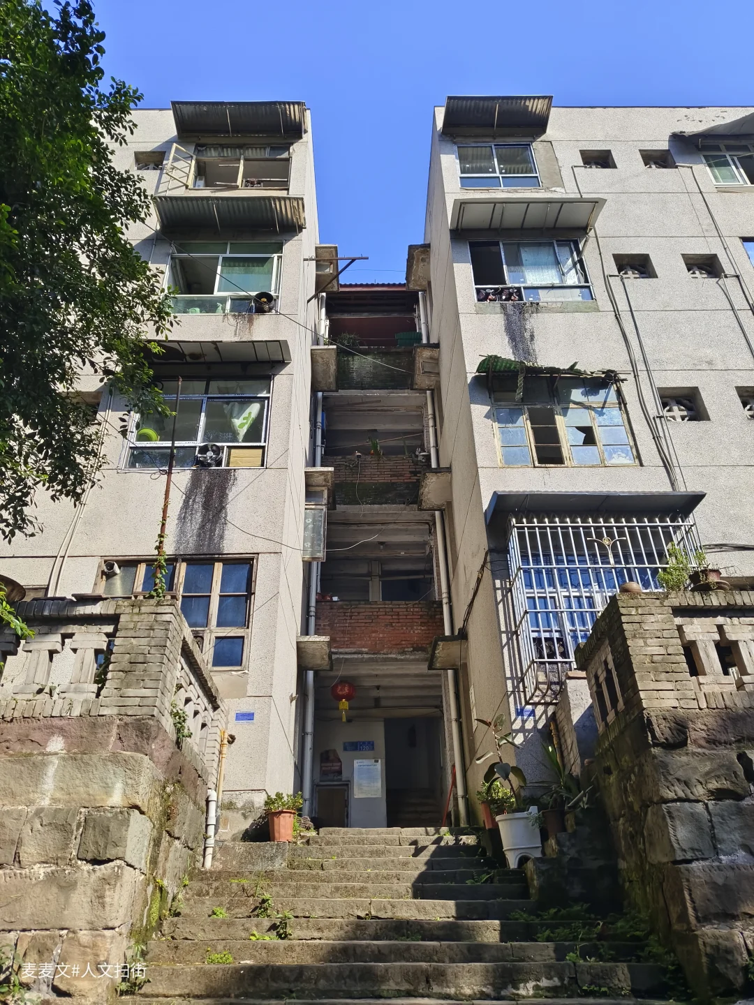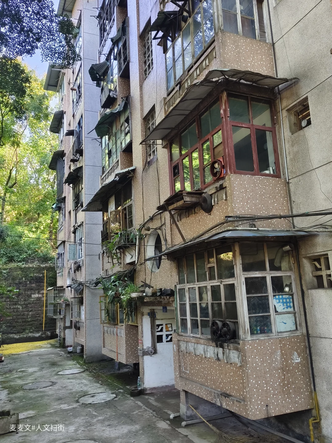 川仪十九厂家属区,紧邻厂区,位于重庆市北碚区东阳街道大沱口社区。家属院里满是岁月痕迹,楼体略显斑驳,外墙的色彩不再鲜亮,空调外机和晾晒的衣物错落,那是生活最本真的模样。老旧的阳台,有的被改造成小小花园,绿植生机勃勃;有的则堆满杂物,似在诉说着日常琐碎。