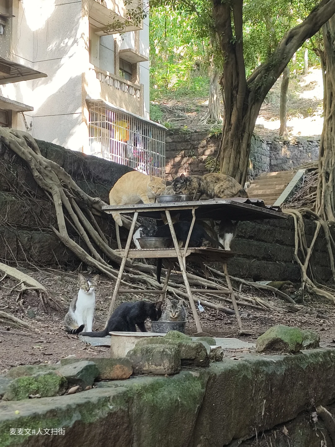 整个院子里,大树撑开浓荫,阳光透过枝叶洒下。有一户人家,他们家就像一个小小的猫咪王国。主人喂养了很多只猫,这些猫咪们形态各异,毛色也不尽相同。几只猫咪慵懒地趴在一张简易的桌子上,专注地舔舐着碗里的食物,旁边的花猫则时不时地抬起头,警惕地观察着周围的动静。