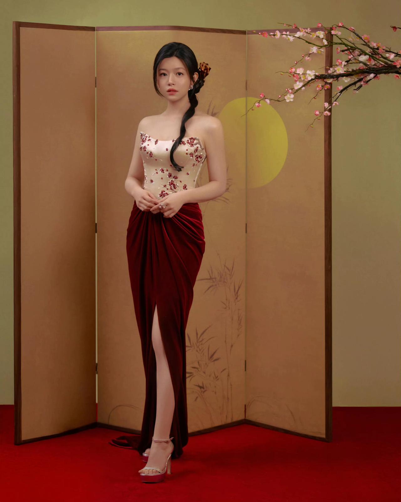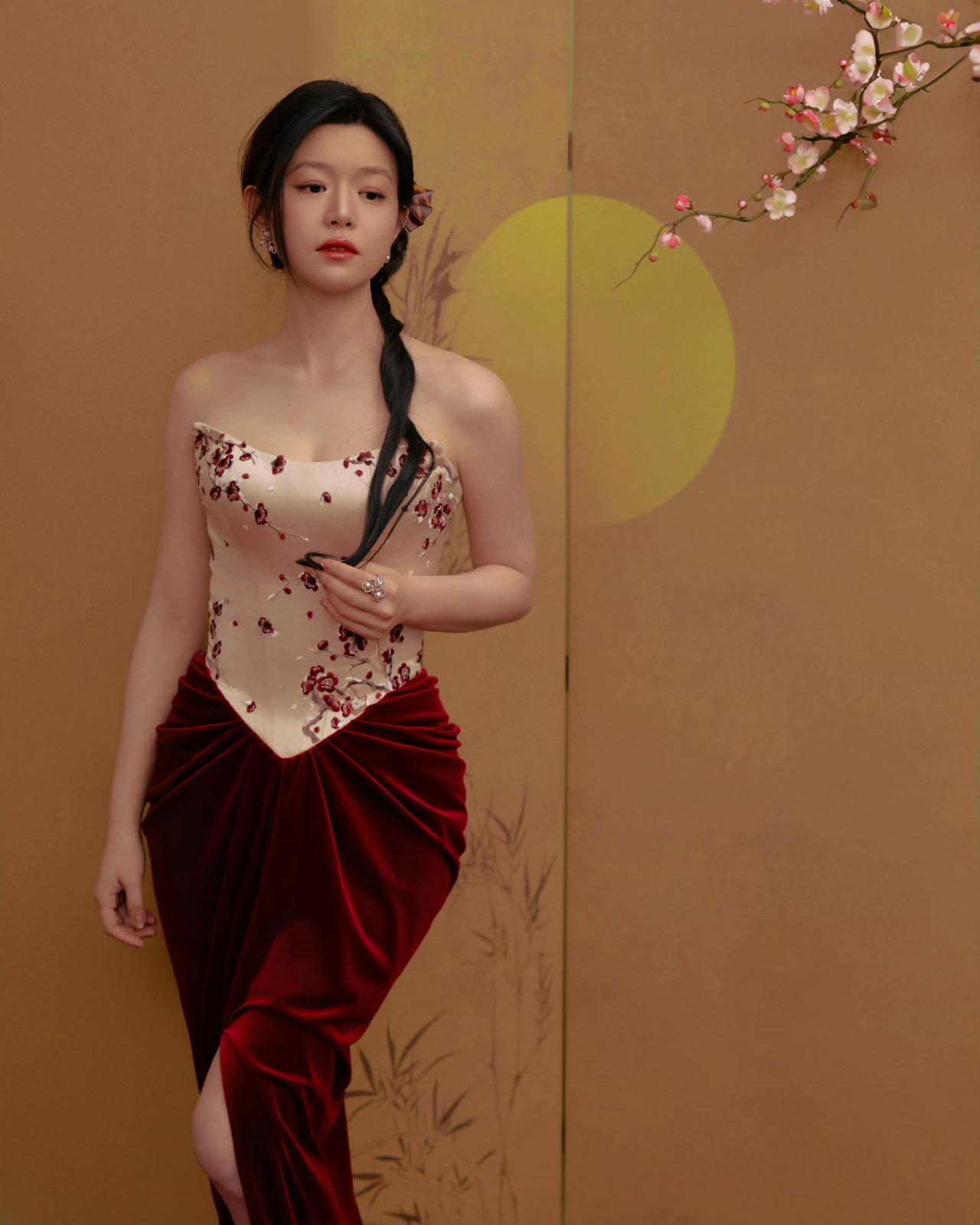 优雅东方风,红衣美人与樱花相映成趣。陈妍希!