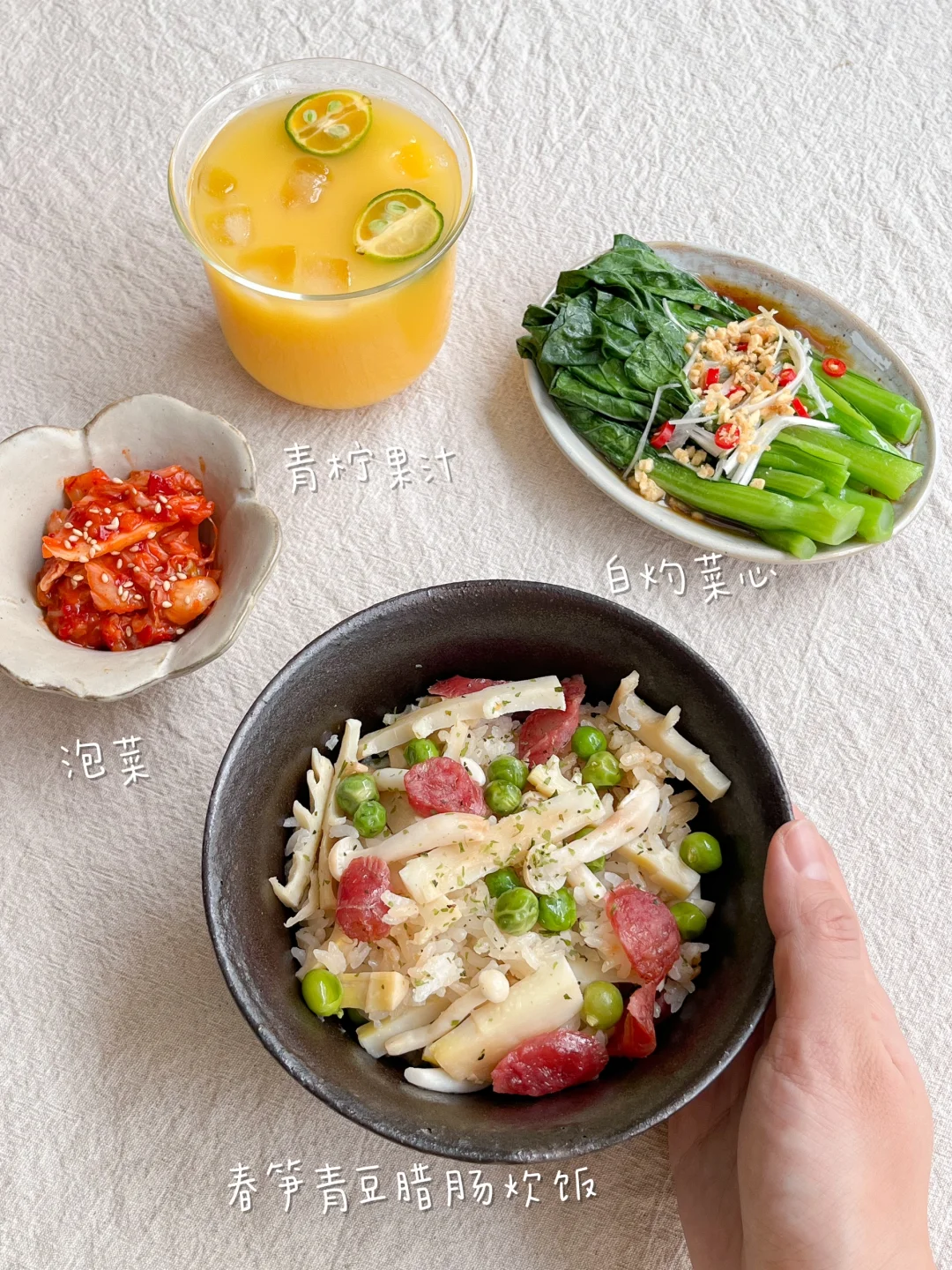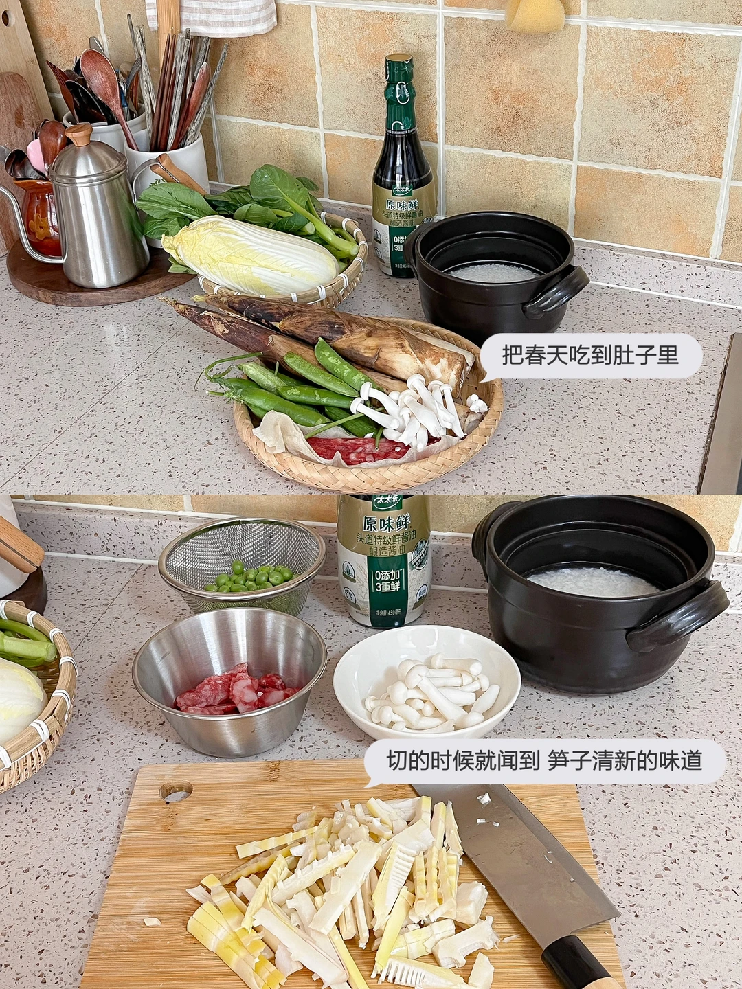 “今天逛早市看到好多新鲜的蔬菜,果然是春天来了,春笋、各种野菜、小甘蓝、新豌豆,所以今天的餐桌是春天的味道~”