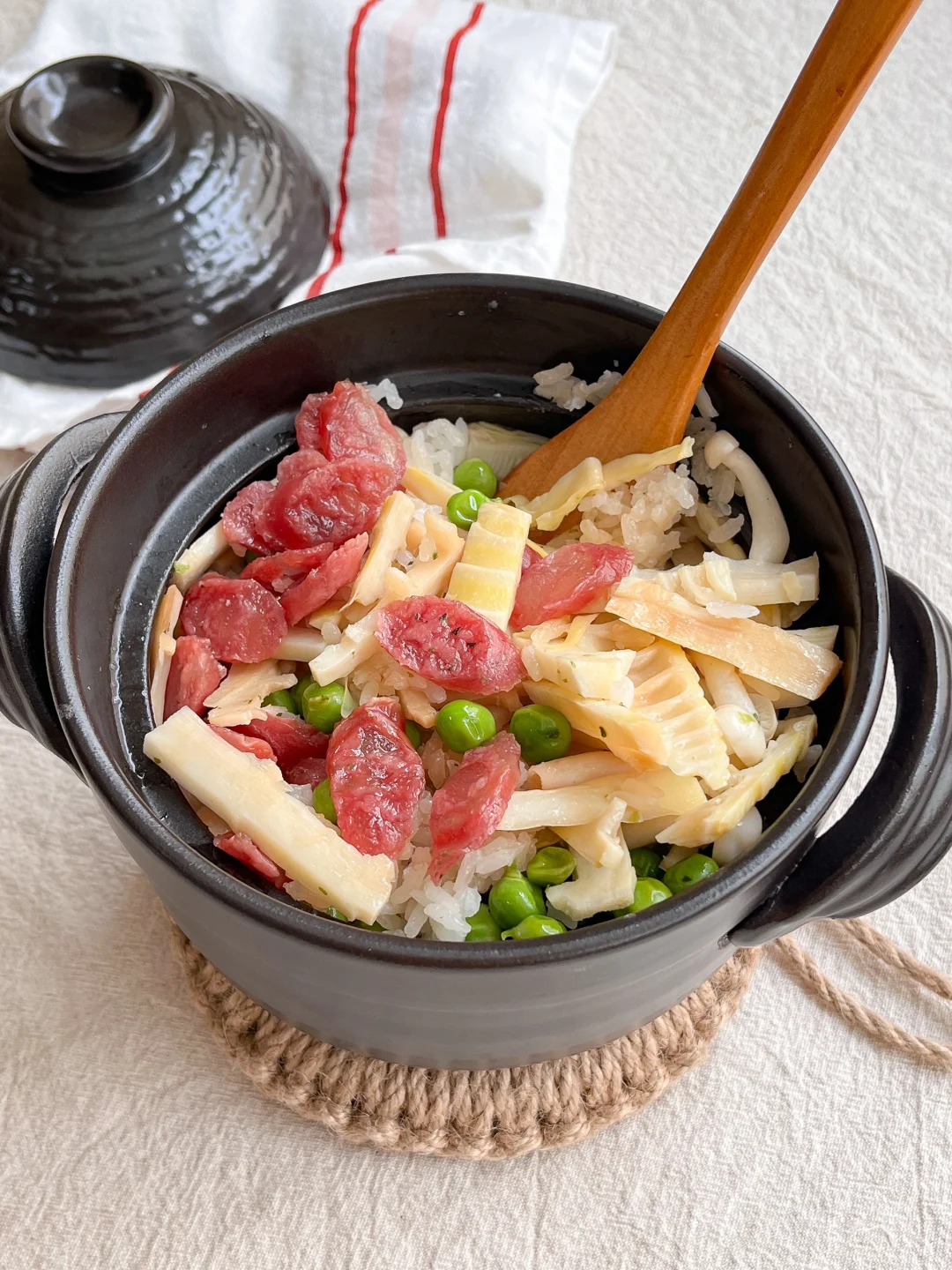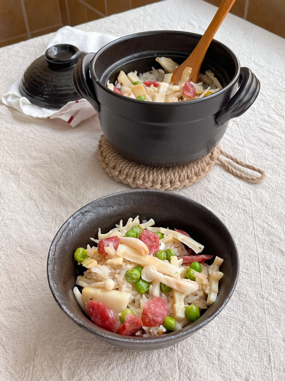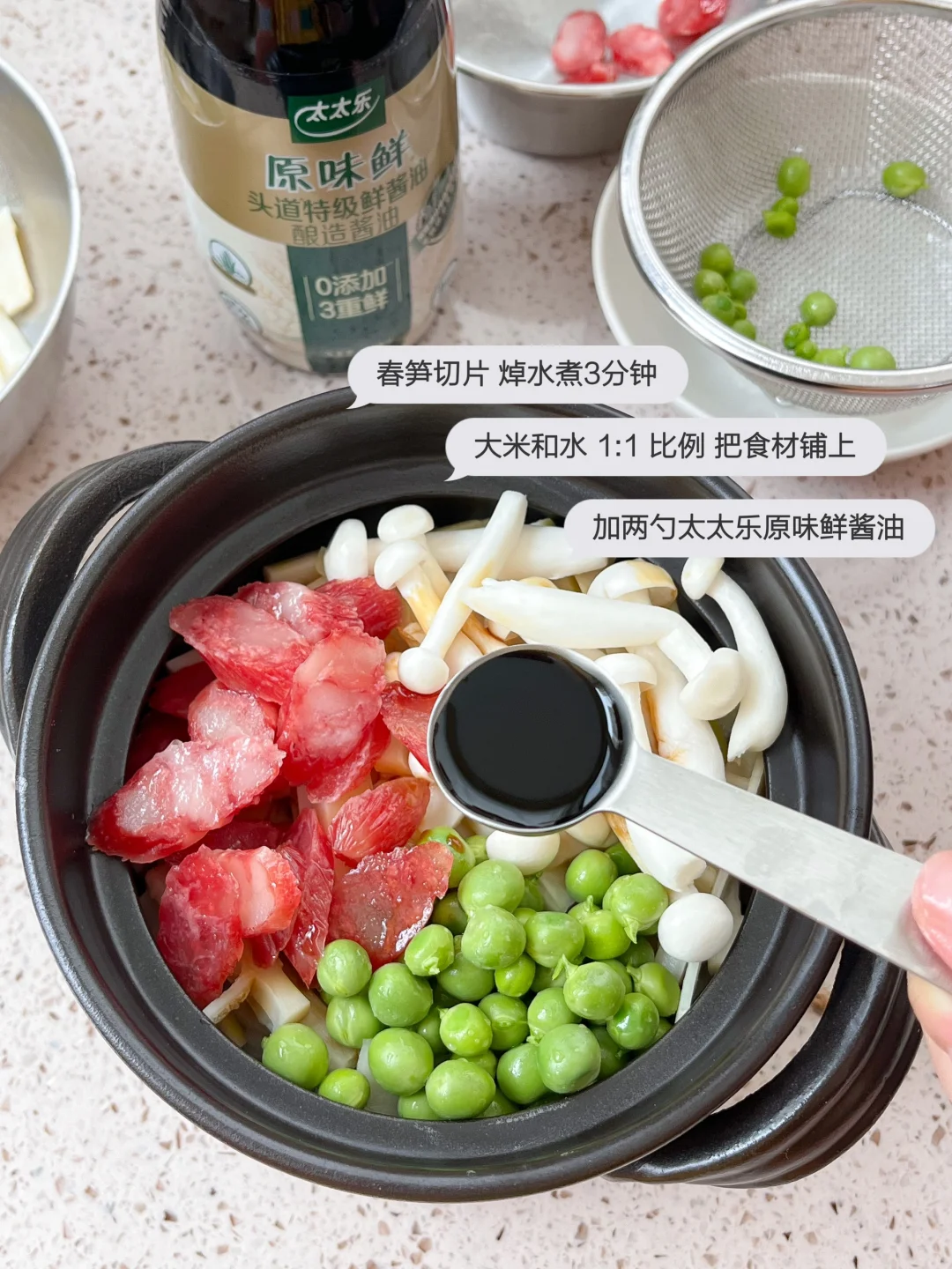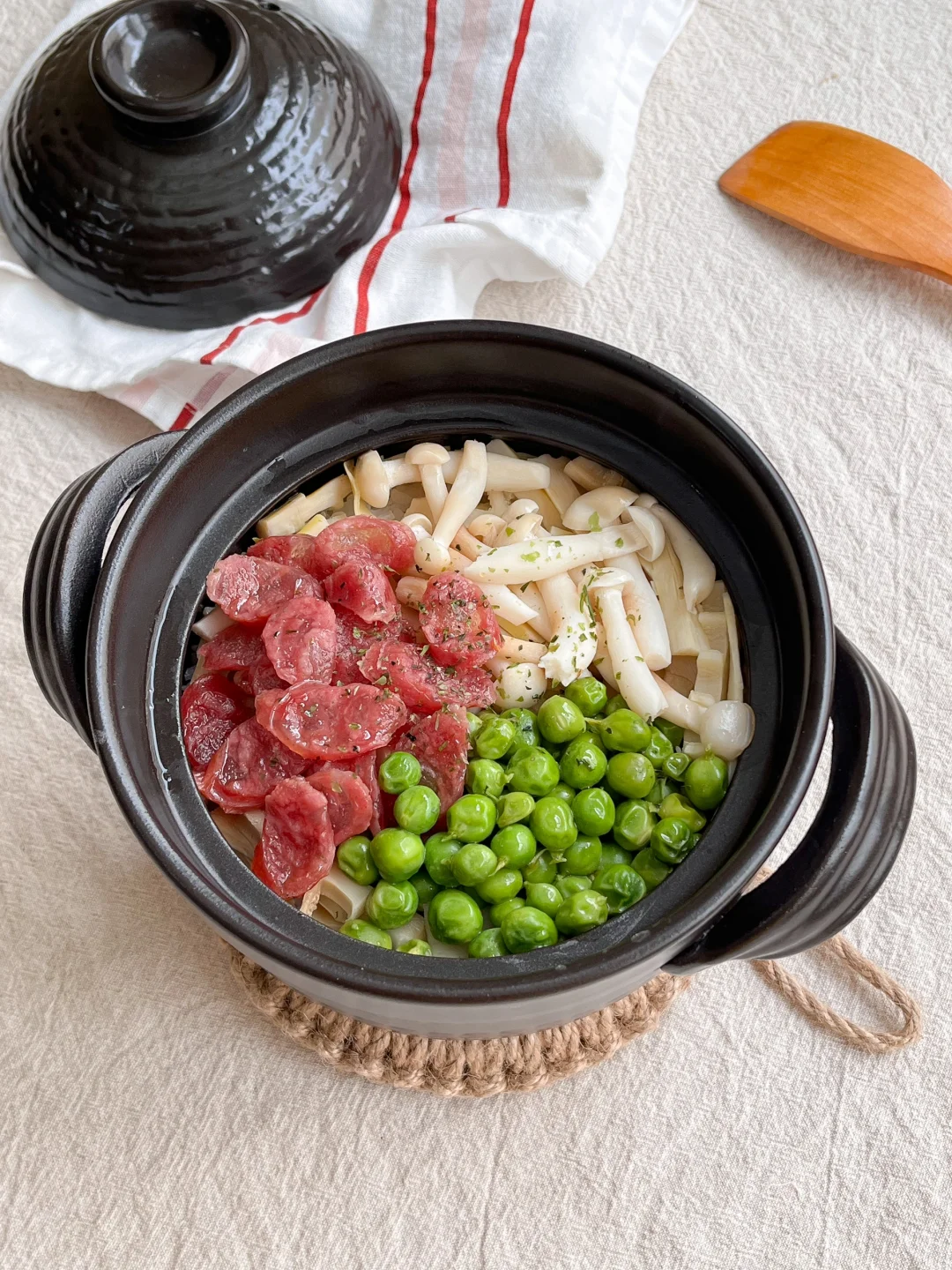 把春笋和豌豆、蘑菇、腊肠放到土锅里