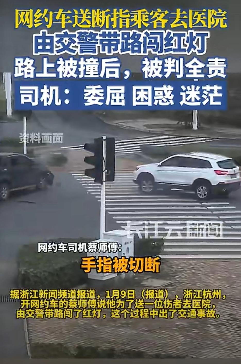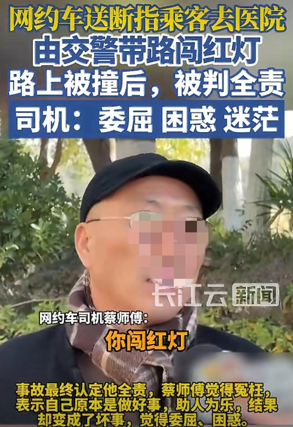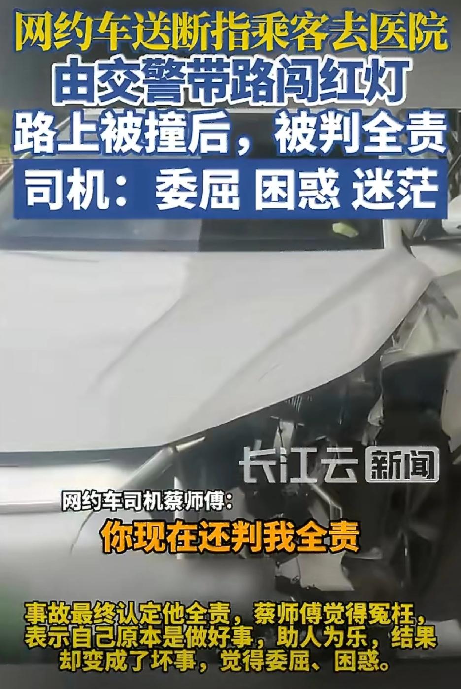 我敢说这个事情如果最后没有处理好,相信以后再也不会有人愿意轻易做好事了。 近日,有报道称浙江杭州的网约车司机蔡师傅为了送断指伤者去医院,所以由交警带队闯红灯,但是过程中意外发生了交通事故,最终判断蔡师傅全责,让他觉得很冤枉,称自己明明是做好事,最后却成了坏事,他觉得很委屈。 这个事情从法律角度来说,蔡师傅全责合理,毕竟总不能判遵守交规的对方全责吧。但是从情来说,这个损失不应该由蔡师傅来承担,不然以后如果做好事都要去考虑成本,权衡利弊,我相信没有人会愿意再去做好事,这个社会只会越来越冷漠,毕竟事不关己己不操心。所以我觉得要么这个损失由交警部门来认,要么给予蔡师傅一个见义勇为奖可以抵扣他本身的损失,这样在维护了法的同时,也同样护住了情。 其实那位伤者只是断指的话,而且交警都来开道了,直接由交警送不是更好,这样谁都能风险最小化。
