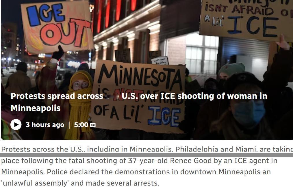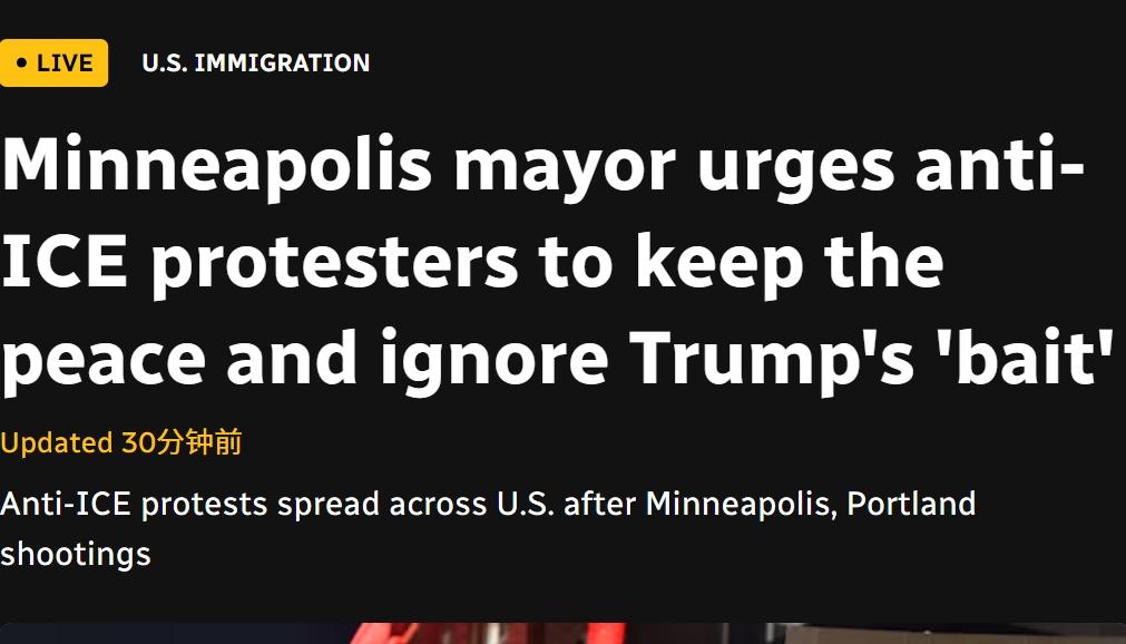 明尼阿波利斯市长敦促抗议示威者保持和平,无视特朗普的“诱饵” ICE特工枪杀37岁的蕾妮·古德后,美国各地,包括明尼阿波利斯、费城和迈阿密在内的抗议活动正在发生 警方宣布明尼阿波利斯市中心的示威为“非法集会”,并逮捕了数人。 组织者表示,周末全美计划举行超过1000场抗议活动,以抗议美国海关与移民执法局(ICE)官员在明尼阿波利斯致命枪击事件后的工作 明尼阿波利斯市长敦促示威者保持和平,无视美国总统唐纳德·特朗普的“诱饵”。 双子城地区的抗议活动大体上和平,但昨晚警方宣布非法集会后,近30人被逮捕。 公共公民组织联合主席丽莎·吉尔伯特表示,这些示威并非反执法。相反,她表示,这些指控旨在呼吁结束ICE的“系统性滥用权力”,以及透明度、问责制以及对古德之死进行独立调查。 吉尔伯特在接受CBC新闻网络采访时说:“我认为人们真的觉得他们已经受够了这种权力滥用。”