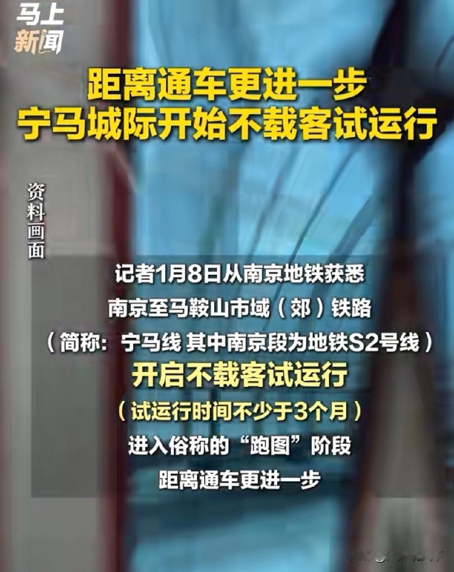 安徽马鞍山到江苏南京的宁马城际,5.1期间大概率会开通运营 安徽省马鞍山市到江苏省南京市的宁马城际,又叫南京地铁s2线。 1月8号开始不载客试运行,试运行时间约为3个月,加上开通前试运行准备工作时间,保守需要4个来月时间,按照这个步骤推算,2026年5.1节期间,马鞍山到南京的宁马城际开通概率非常大。 目前南京的跨省地铁线路分别是:s2宁马线,s4线宁滁线。 宁滁线滁州段已经开通运营,南京段预计2027年开通运营 南京都市圈另外一个城市芜湖市,本身就有单轨,民间一直呼吁,尽快让芜湖单轨与宁马城际连通,芜湖单轨1号线保顺路站距离当涂南站只有11公里,未来打通的可能性还是有的。宁马城际南京段 宁马城际 宁马轨道交通 宁滁城际南京段 宁滁轨道交通